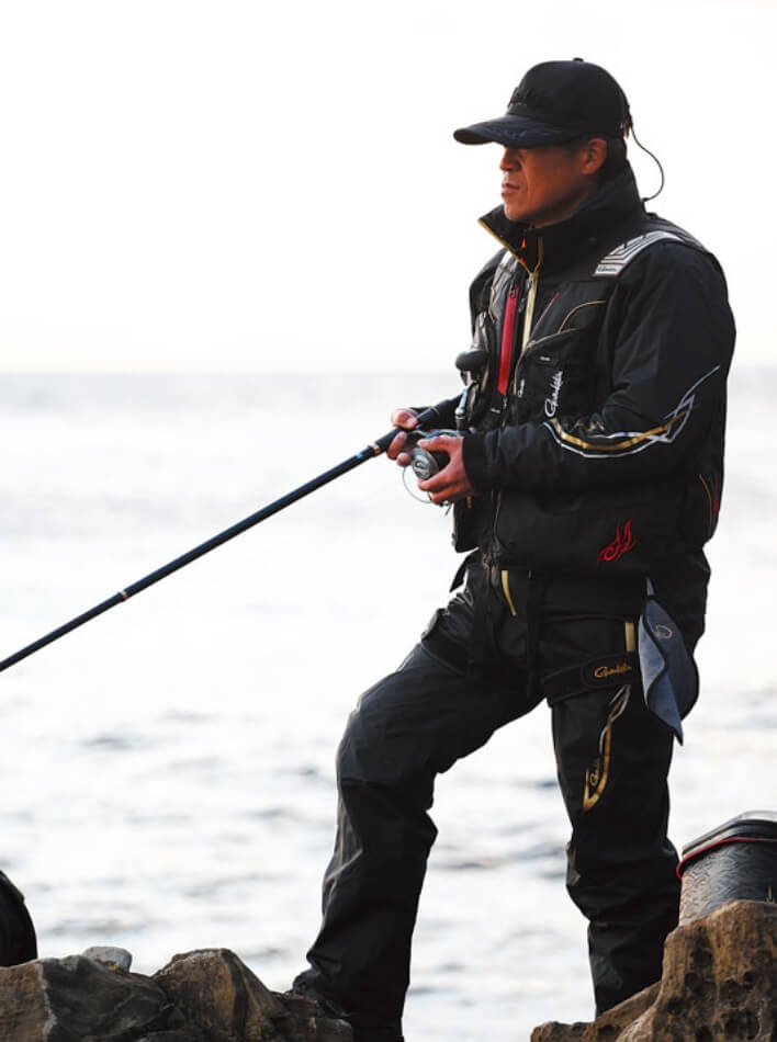 手に持つのは、がま磯きっての剛竿、2022年秋に新生した『我夢者アルティメイト』。まだ見ぬ大物との勝負ということをコンセプトにした夢あるロッドだ。