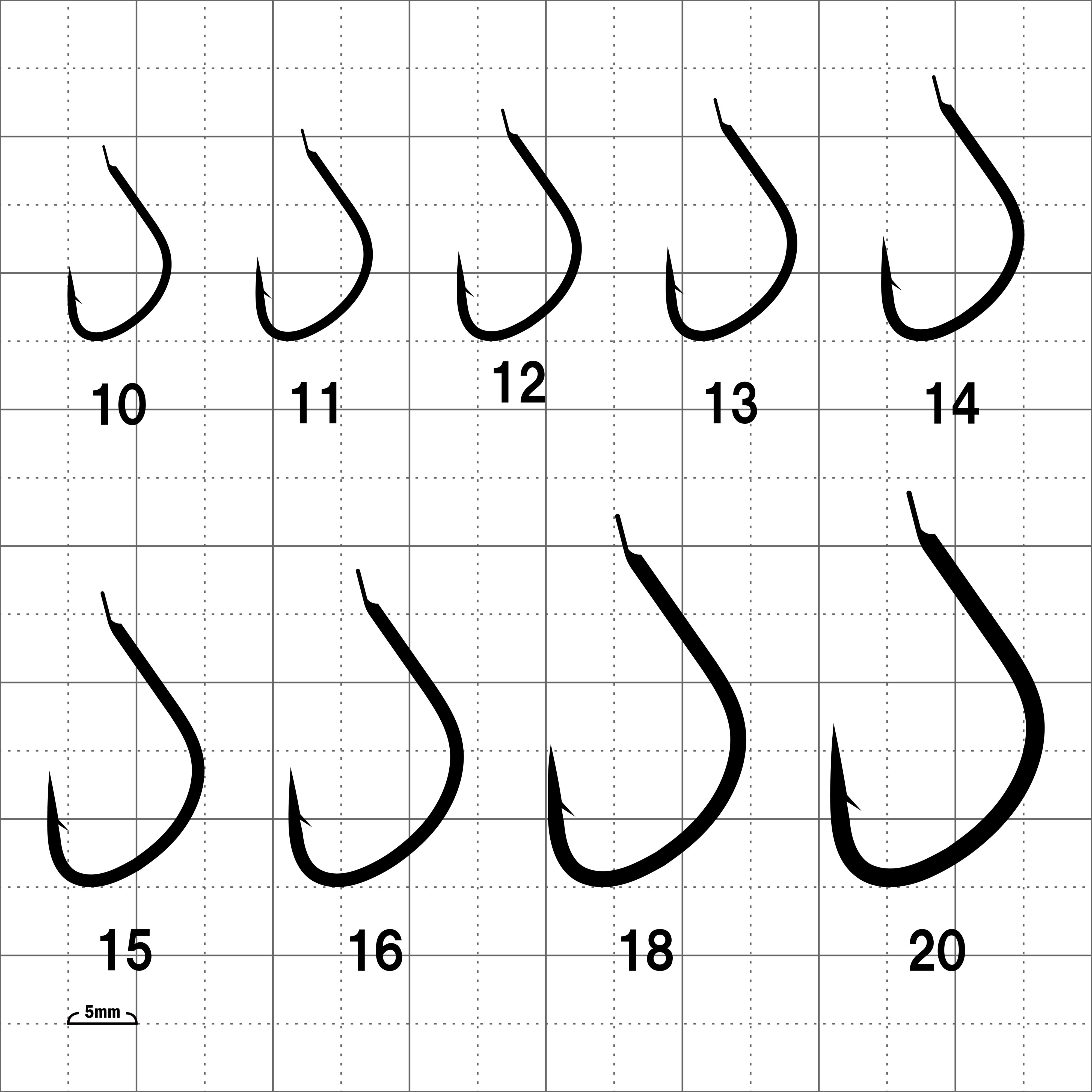 フトコロが「くの字」に曲がり、鈎先はチモトを向いています。この形状が「アケミ貝」や「丸サナギ」を刺すのに適しています。根掛かりが少ないのもこの鈎の特徴。