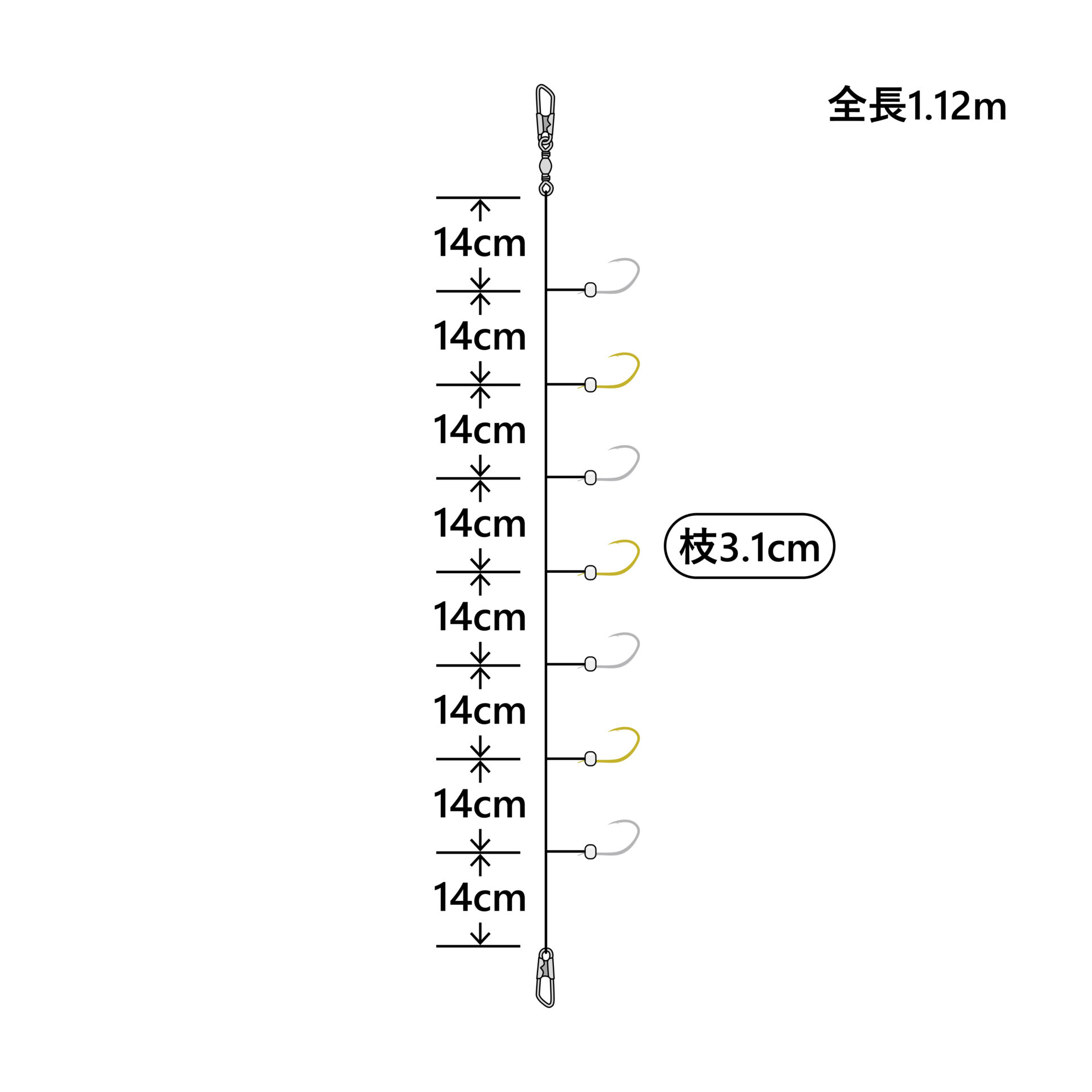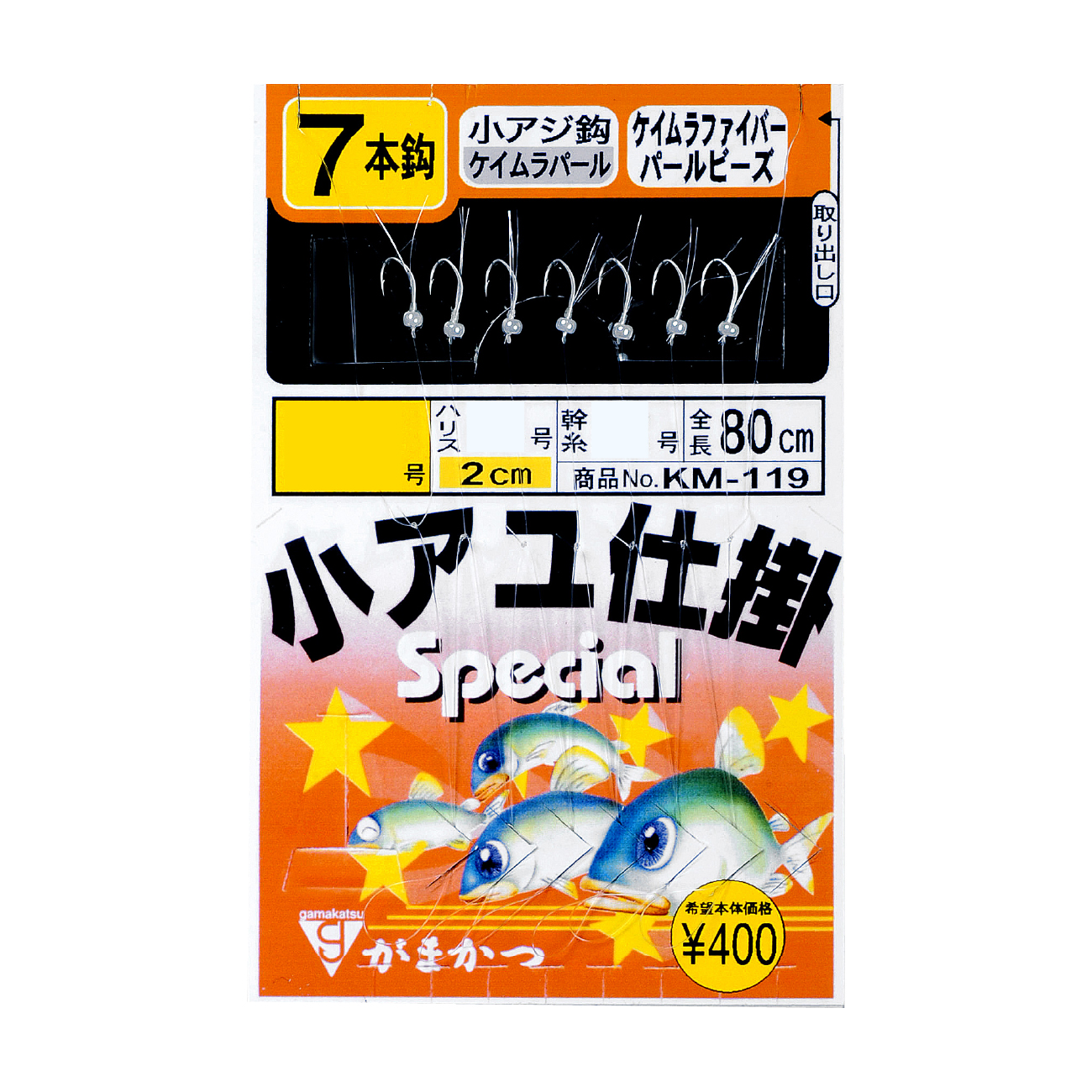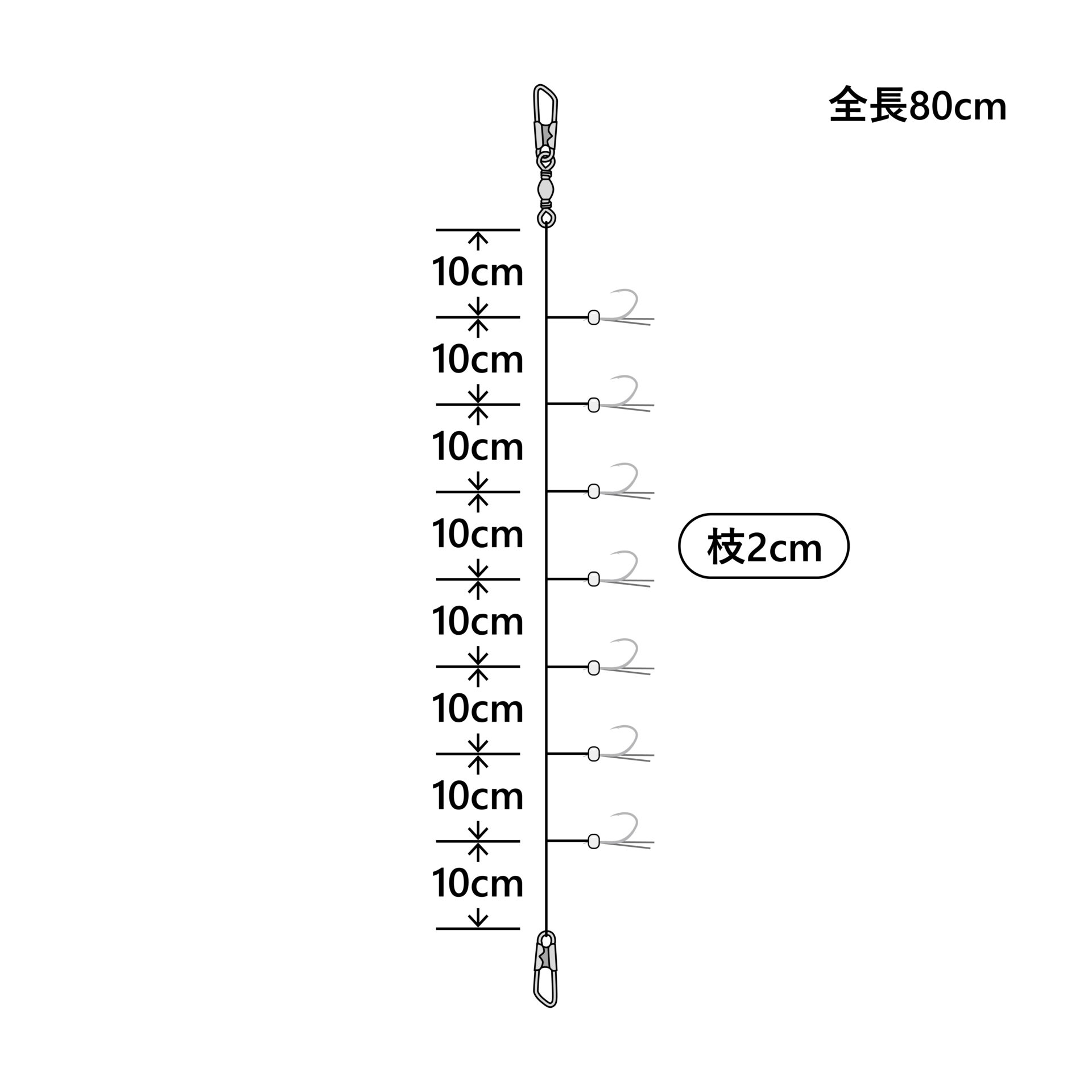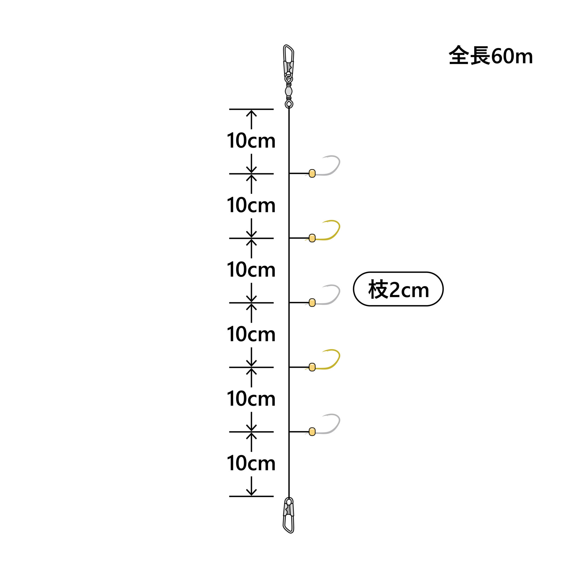 キープ力が高くキラメキ効果の高い小アジ鈎に、シラス餌を模したパールビーズを付け、さらにケイムラファイバーが食いを促進させます。水深の深いポイントで、幅広い層も探る事ができる7本鈎仕掛です。