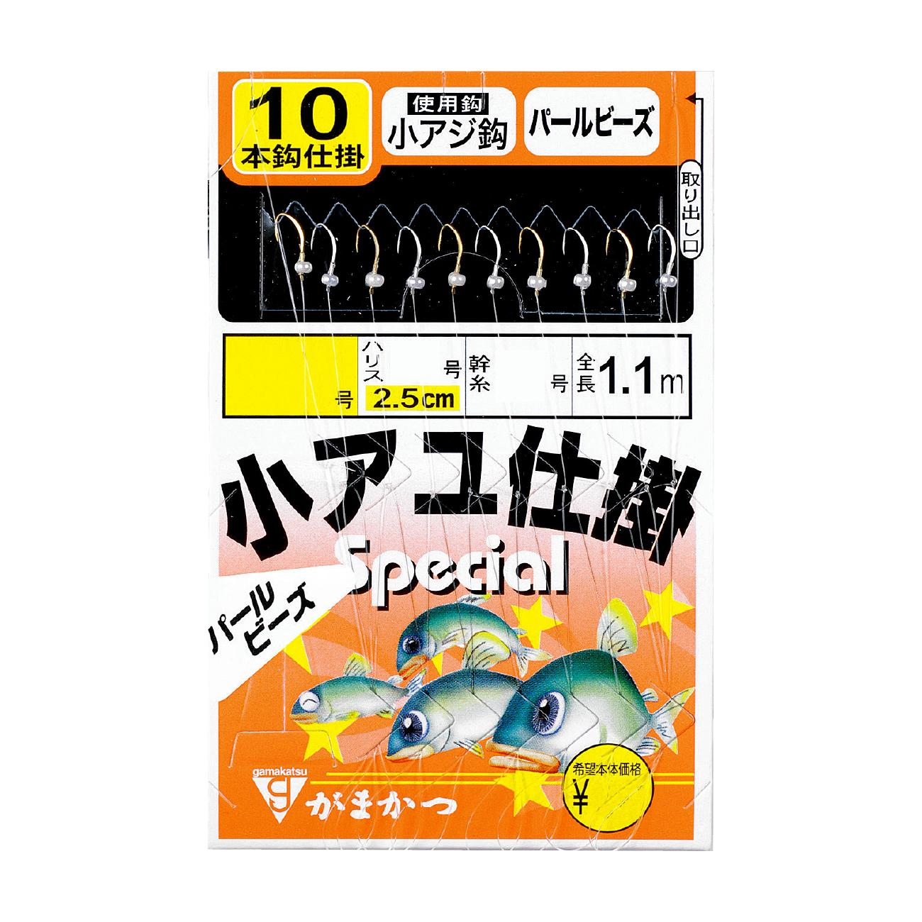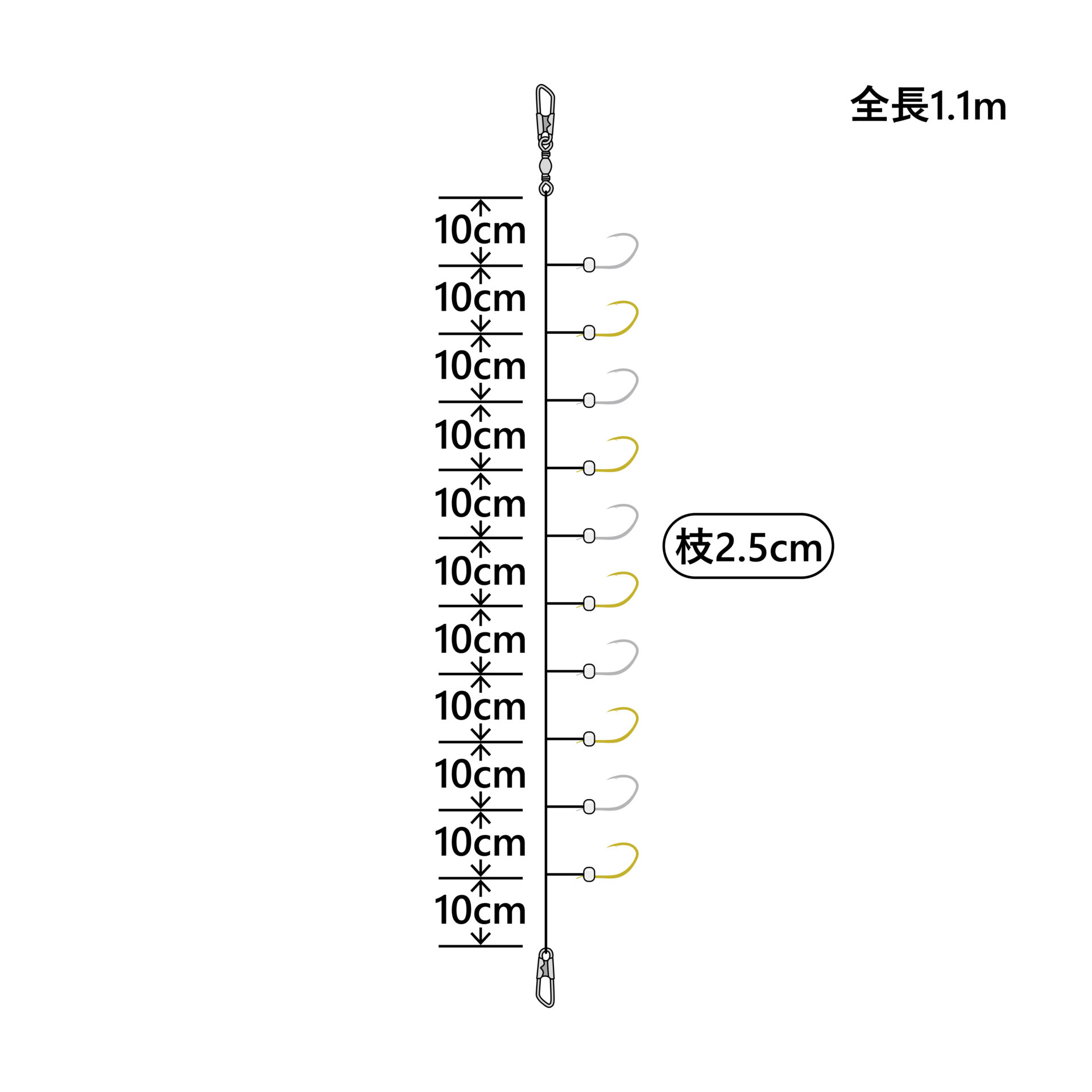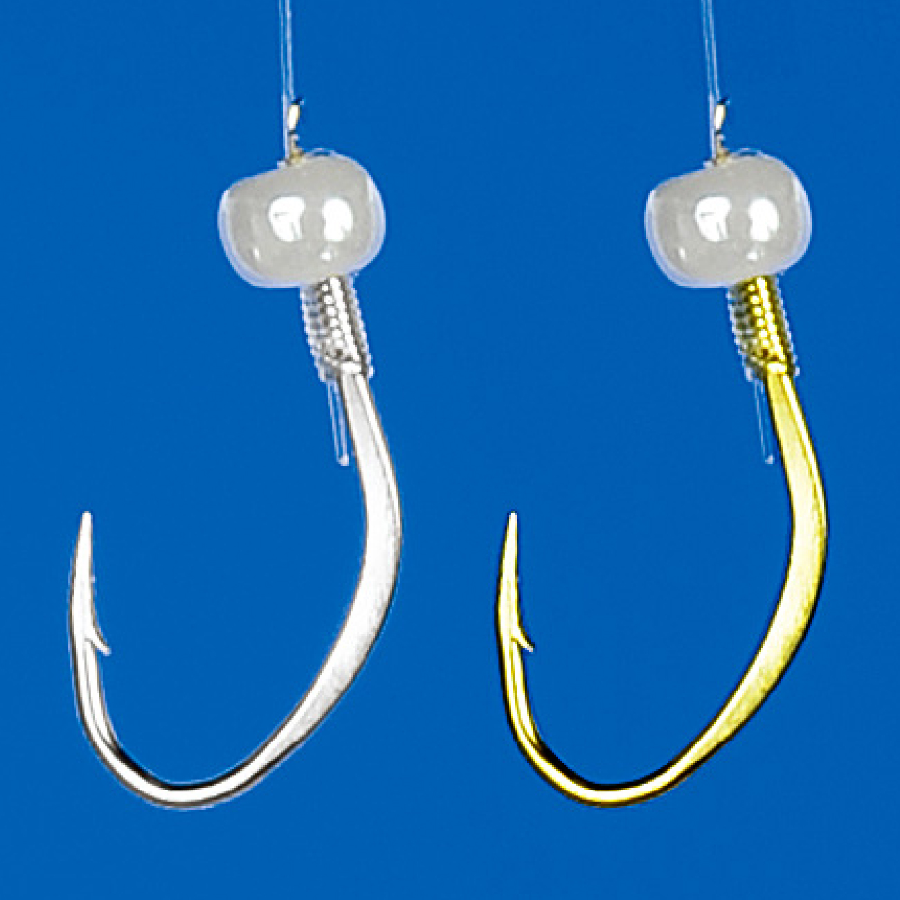 キープ力が高くキラメキ効果の高い小アジ鈎に、シラス餌を模したパールビーズを付け、実績十分!岸壁や水深の深いポイントで、幅広い層を探るための10本鈎仕掛です。手返しの上手な玄人の方に!