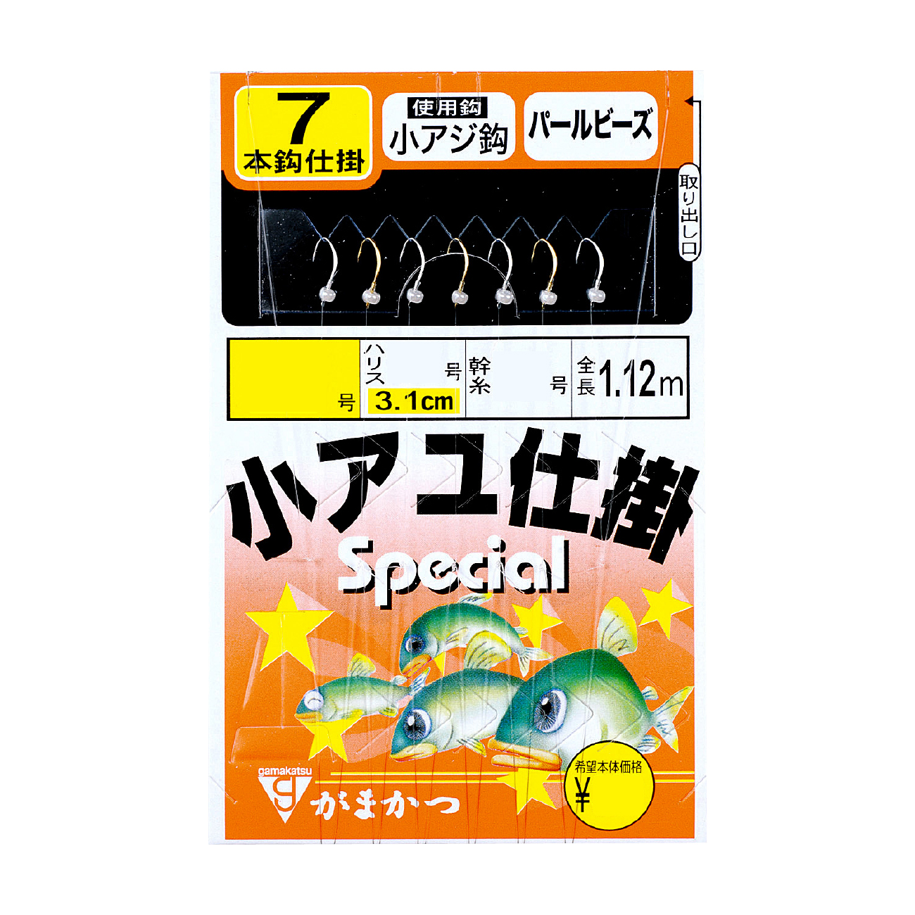 キープ力が高くキラメキ効果の高い小アジ鈎に、シラス餌を模したパールビーズを付け、実績十分!水深の深いポイントで、幅広い層も探る事ができる7本鈎仕掛です。岸壁ポイントでは人気No.1で超ロングセラー!