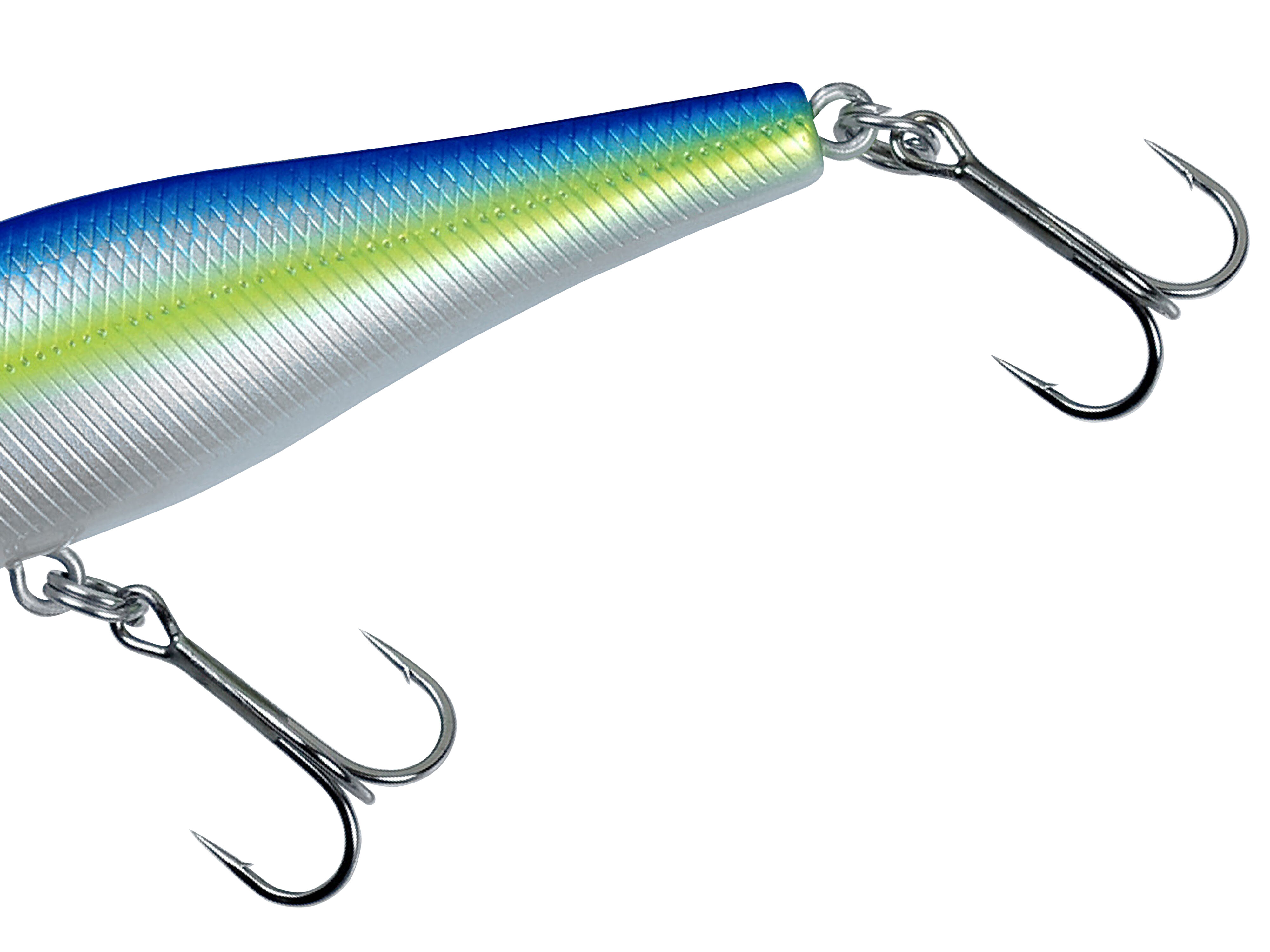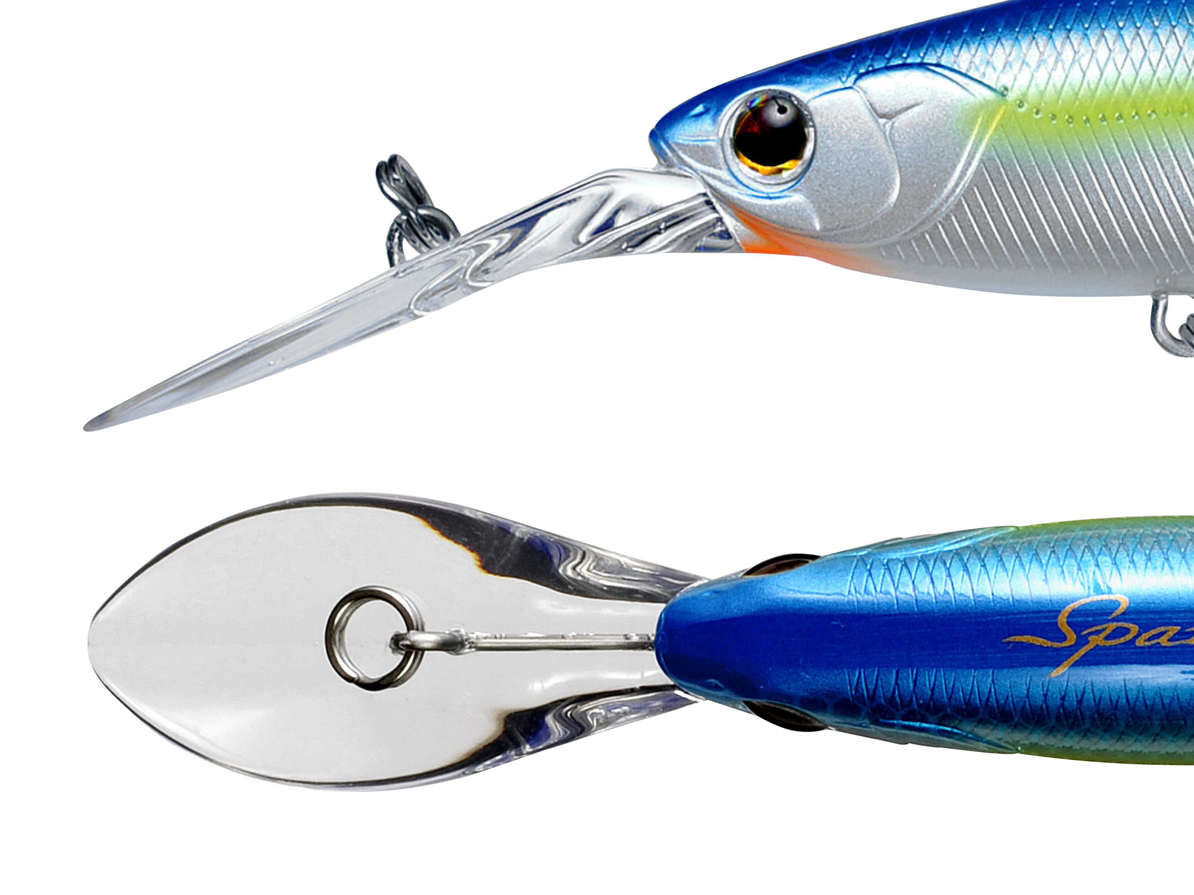 極限にまで薄くする事で、水噛みのレスポンスを向上。リトリーブ時におけるアクションの初動の速さとダートアクション時の鋭い切れ味が特徴です。アイをワイヤースルー化し、ボディー前方で固定する事で強度不足を解消しています。