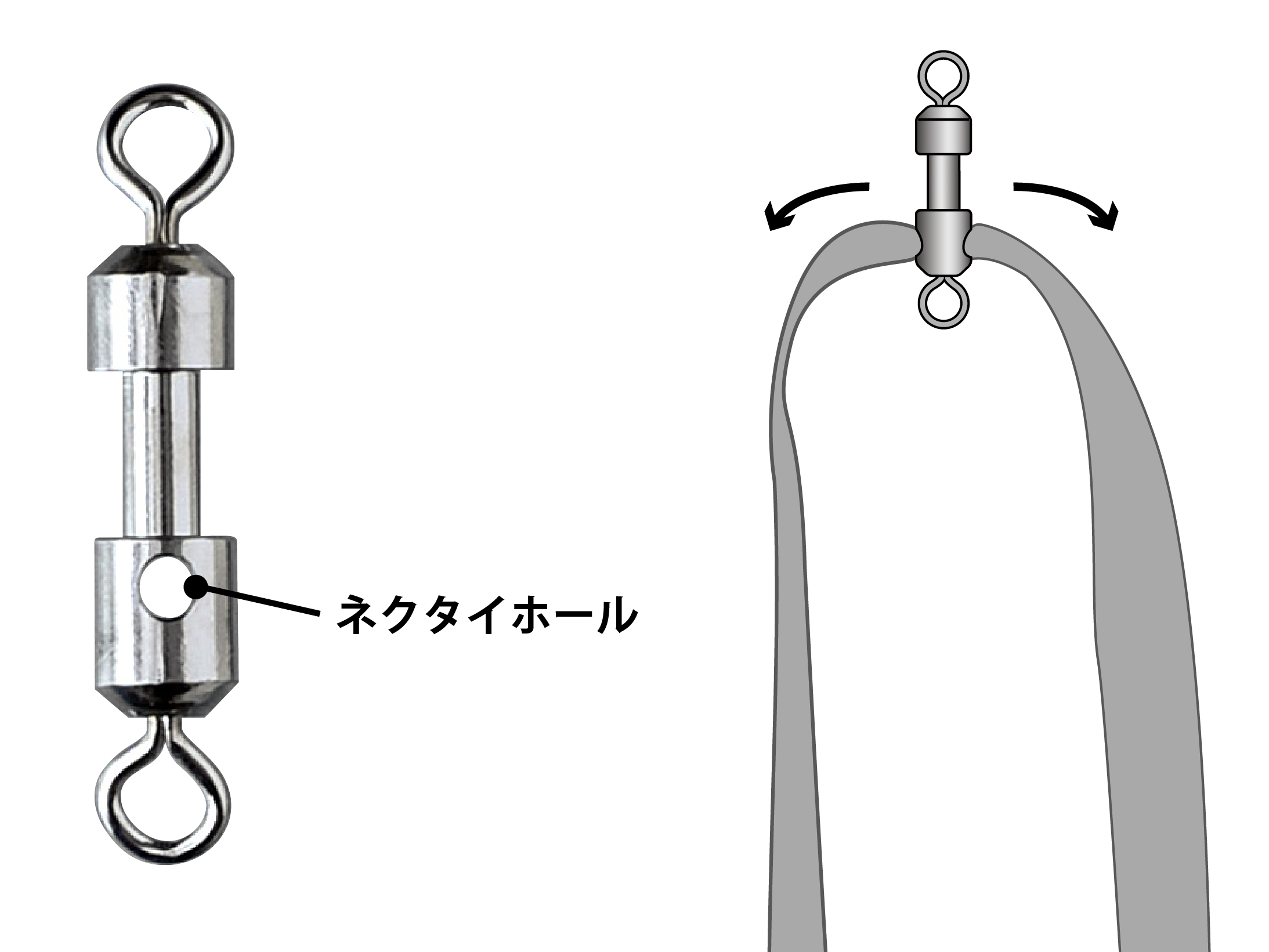 特殊な製法を用い、強度を損なうことなく表面の滑らかな穴をど真ん中に開けた今回のスイベル。この穴に専用ネクタイを通すことにより、ネクタイを左右均等にフレアさせつつ、引き抵抗を最小限にしながらも高アピールのネクタイセッティングが可能になりました。(GM1883 スレッダーを使うとネクタイを簡単に装着できます。)