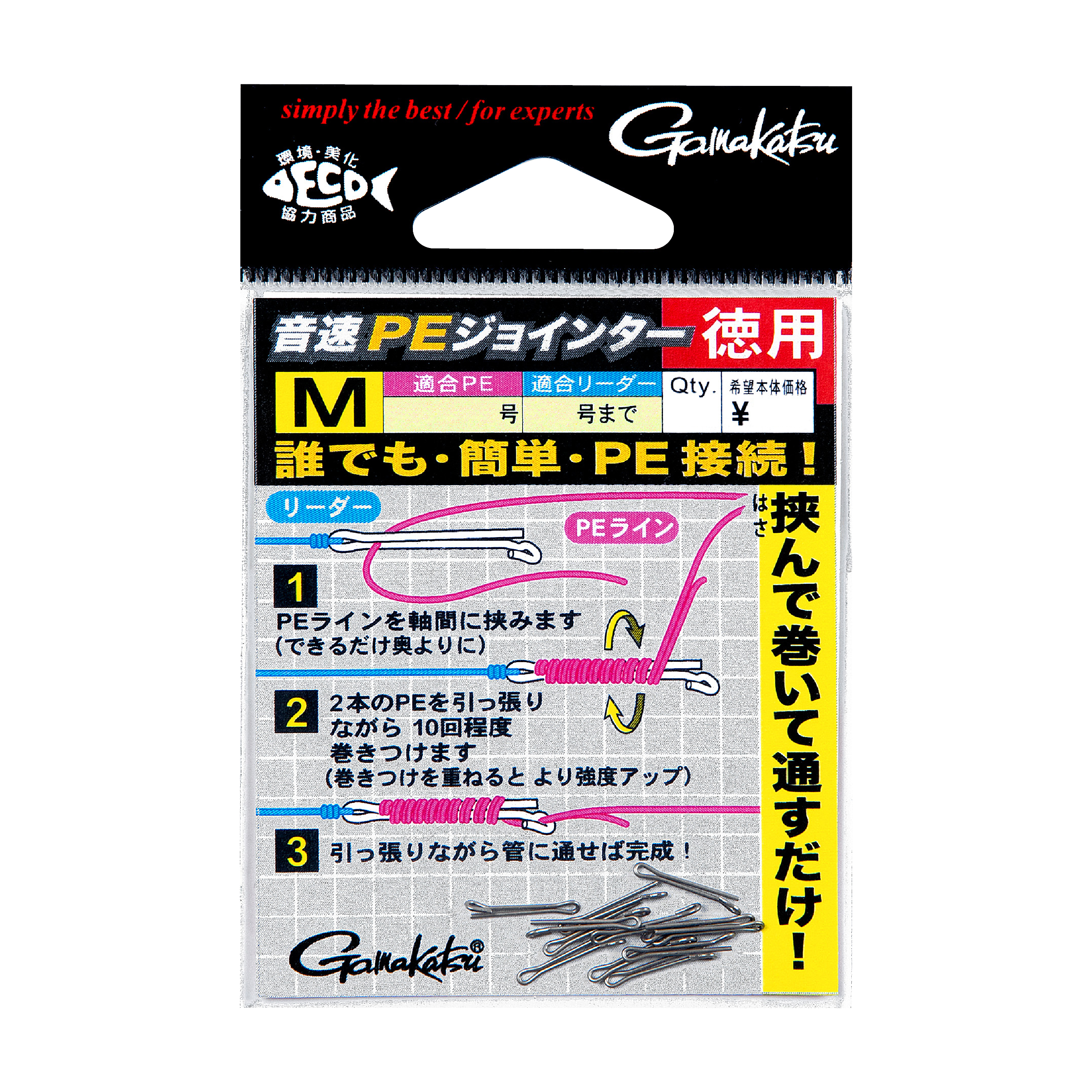 複雑なノットに匹敵する結束強度最大90%以上を実現!!接続方法が簡単なので、強風時や暗い場所でもスムーズに接続ができます。また、短い時合いの際にラインが切れても、すぐに結束ができるため、諦めずに釣りを再開することが出来ます。初心者の方はもちろんのこと上級者の方も必須アイテムになること間違いなし!0.1号~2号までのPEラインであれば釣種を問わず、様々な釣りに使用可能です。この音速PEジョインターを持っていれば快適な釣りが可能になります。