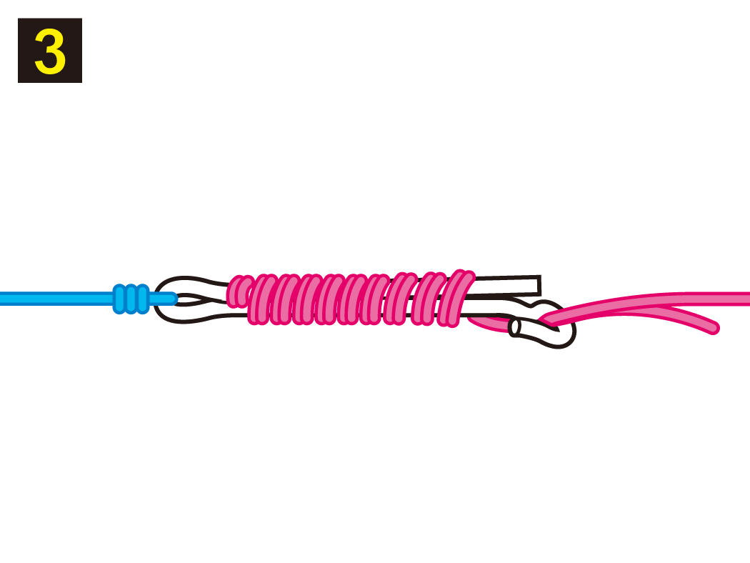 ②2本のPEを引っ張りながら10回程度巻きつけます。