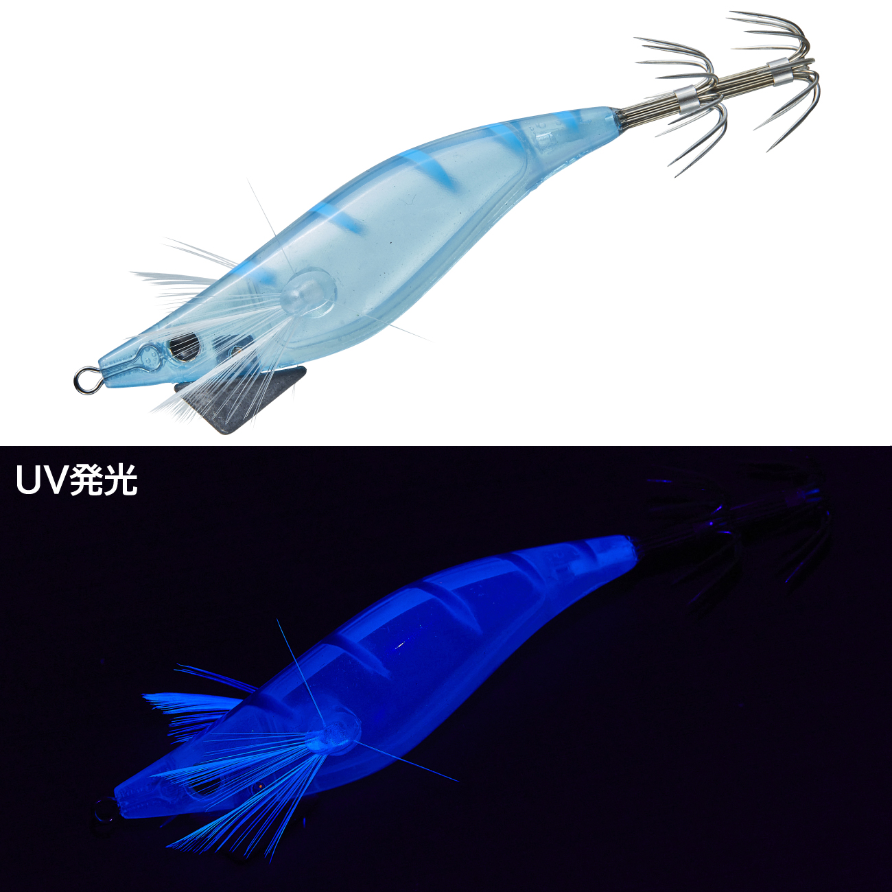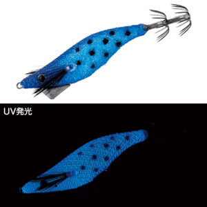 小浜・敦賀方面で実績の高いブルー系カラーをベースに微生物をイミテートしたブラックスポットをあしらったカラーです。ボディー部はUV発光仕様となっており、UV発光に高反応を示す状況に最適です。