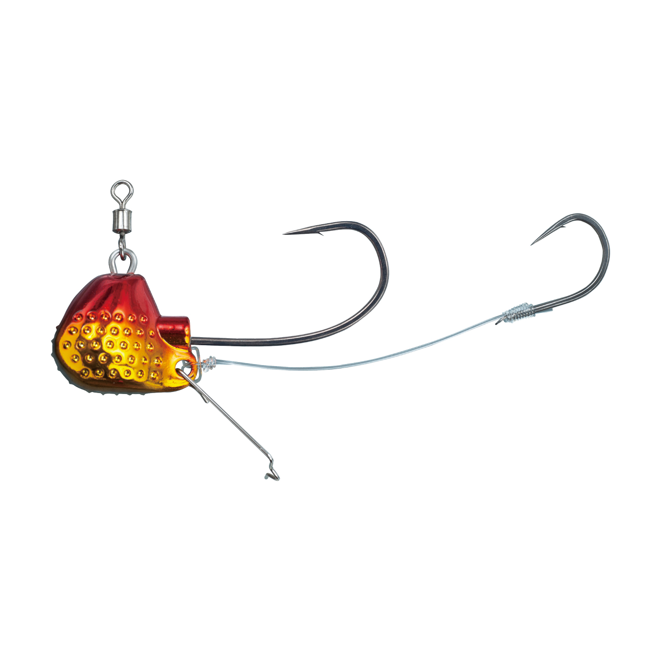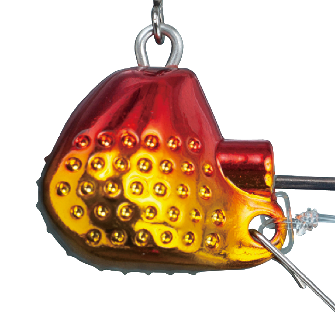 高比重タングステンの採用と重心位置の徹底検証により急速フォールを実現。着底時にはテンヤ底面に設けられた「ボトムタッチバンパー」によりボトムでの接地面積を減らし、クリアな着底感を実現。ヘッド側面のディンプル加工は、凹凸による明暗効果と誘いの際の高いフラッシング効果により広範囲の真鯛を魅了します。親鈎は度重なる実釣により導き出した、即アワセに最適な鈎先角度「ゼロアングル」を採用し、コンタクト性を重視した孫鈎と相まって高いフッキング率を実現します。さらに、エビをしっかり固定でき、素早く脱着可能な「ワンタッチエビキーパー」の採用によりエビのズレを防止することで手返しの良い釣りを展開できます。
