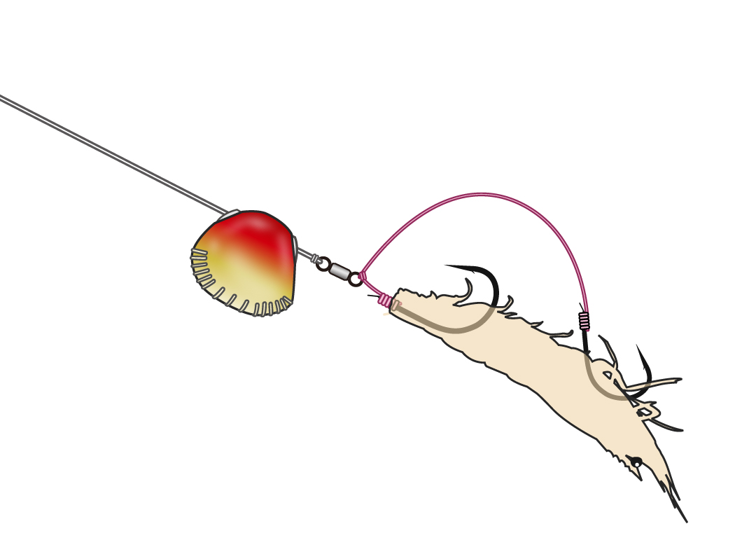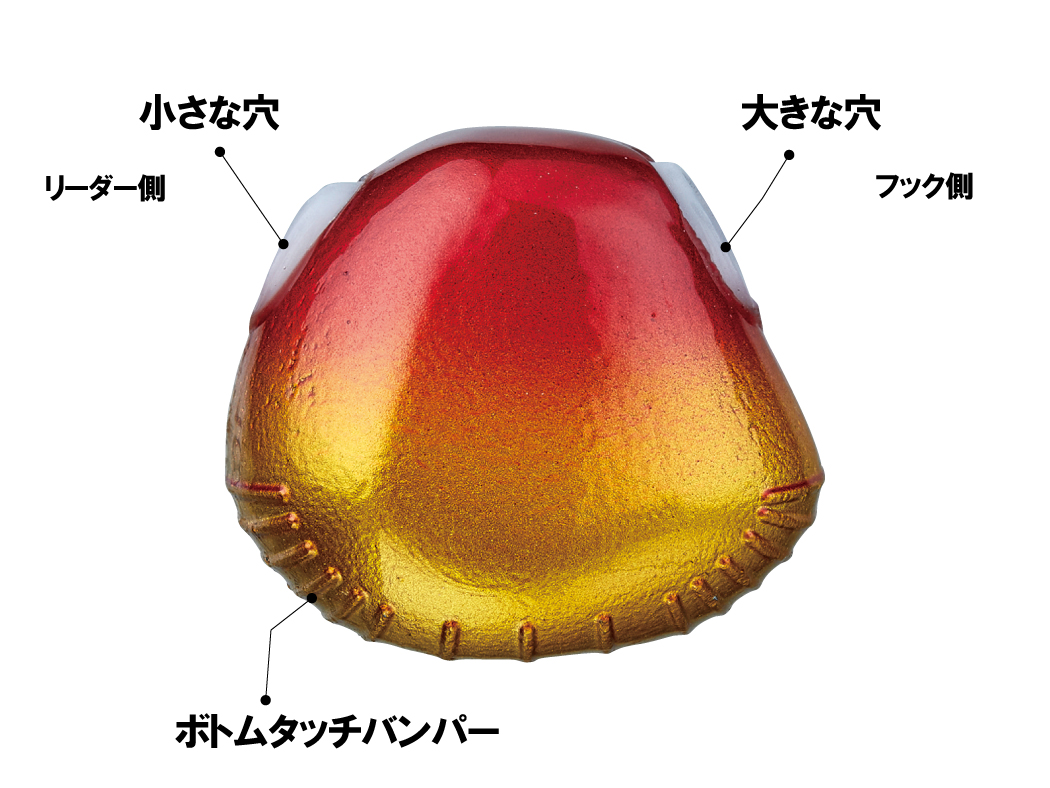 側面、正面、底面ともに三角形を基準に曲線でつないだ独特のデザイン。フォール姿勢の安定したヘッド形状で、リフト時にもブレが少なく潮の抵抗も軽減し、操作性抜群。底面部分にはボトムタッチバンバーを採用し、着底感度アップとともに着底時の塗装を保護。リーダーを保護するため、ラインホールには高強度の樹脂パーツを組み込み、フック側はスイベルソケットシステム搭載で、遊動式鯛テンヤだけでなく、鯛ラバ用シンカーとしても利用可能。着底姿勢が安定しているので、ボトム付近でのバイトが多いシャローエリアでは非常に有効な武器となる。