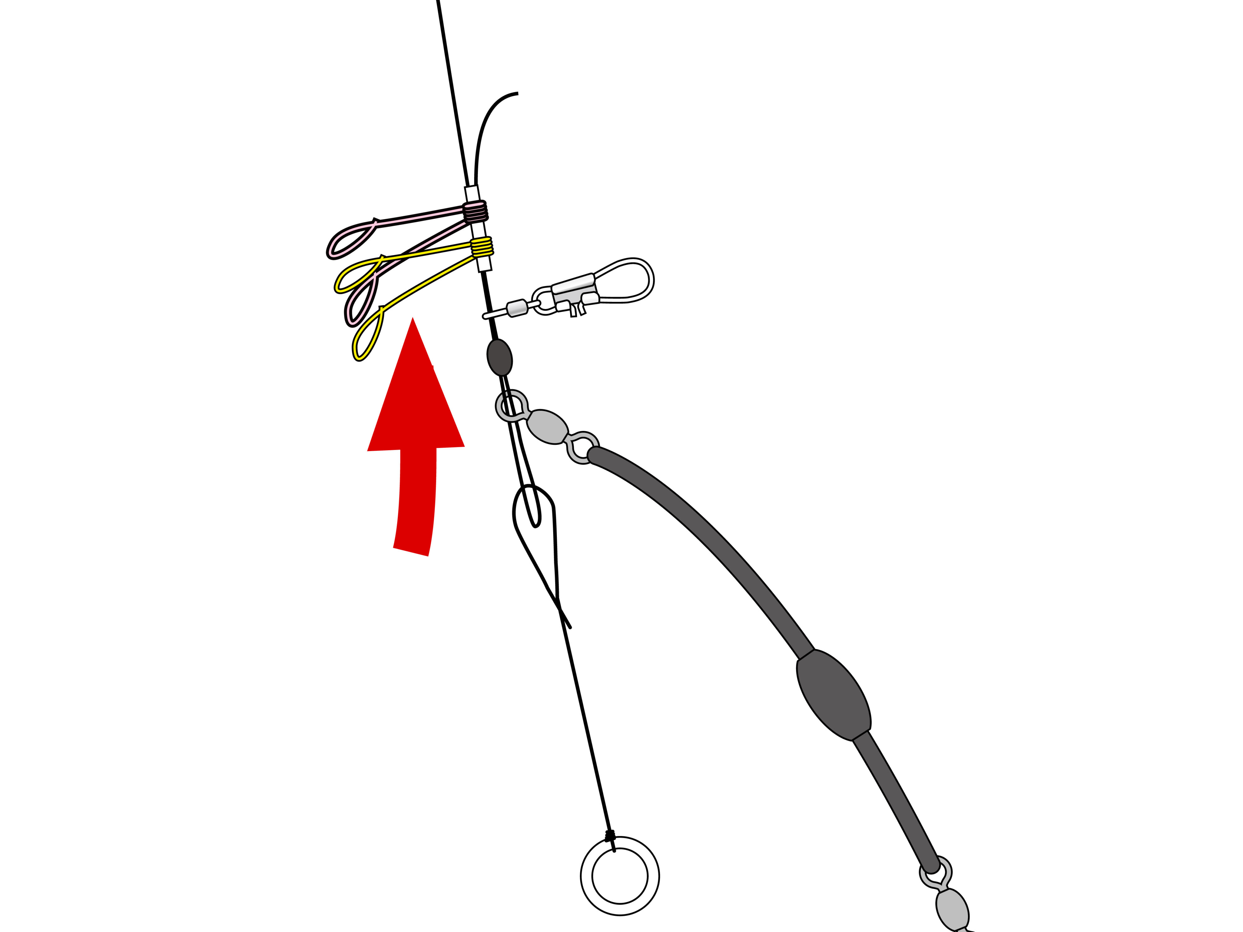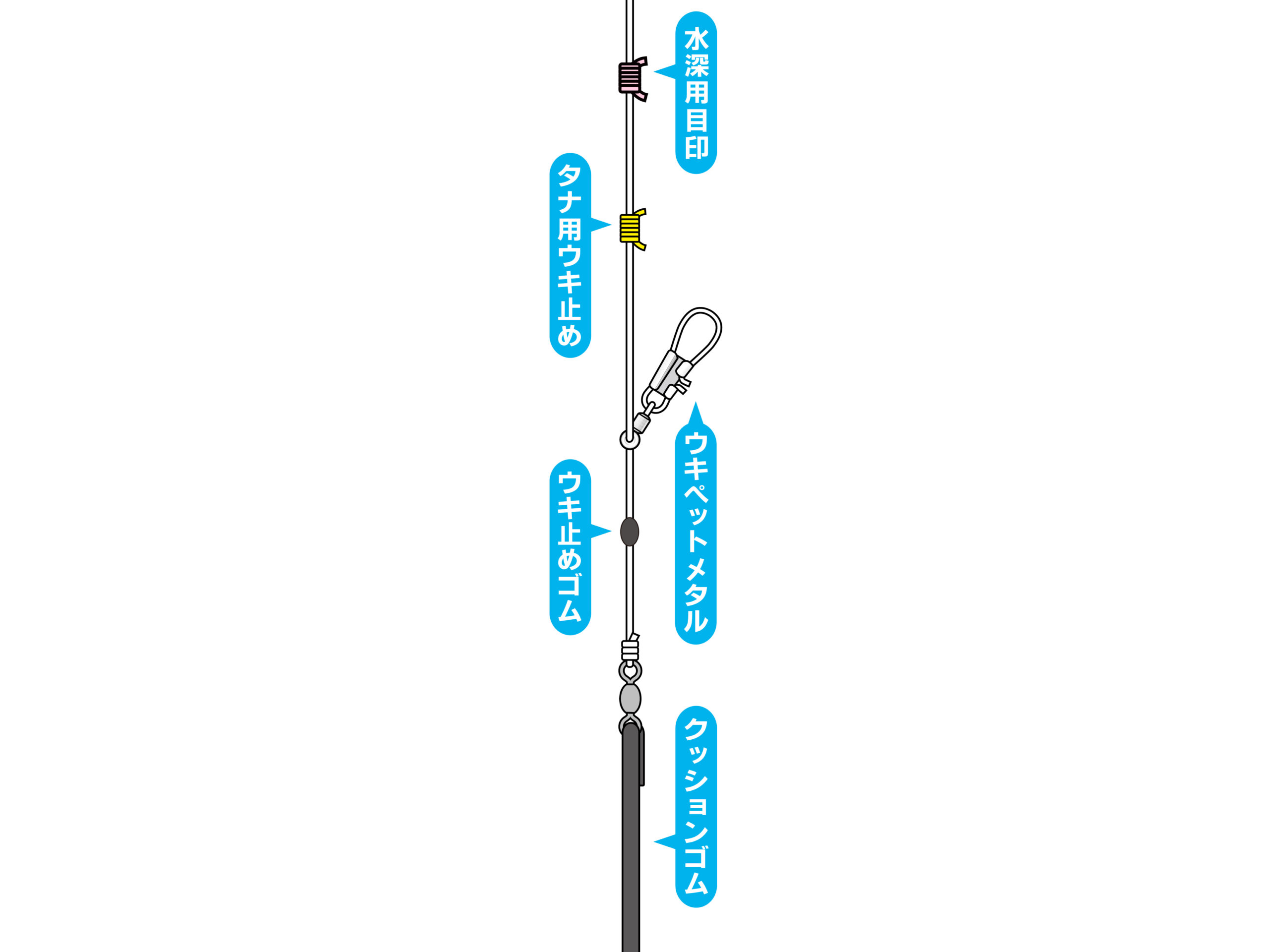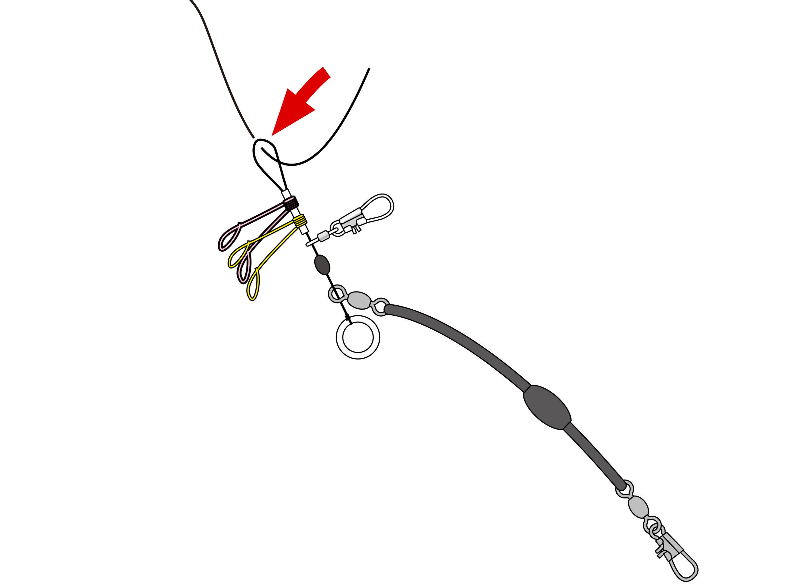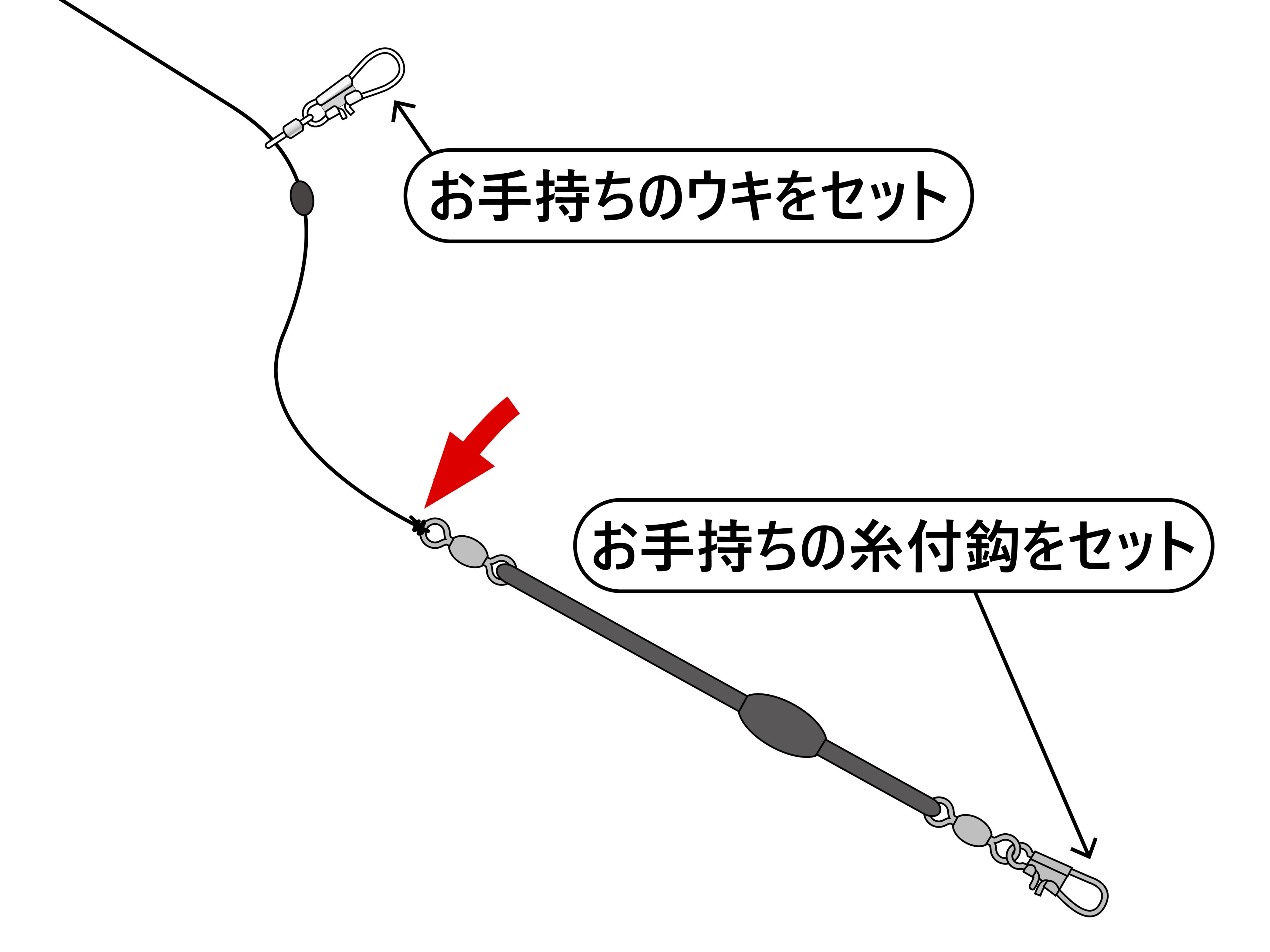 3.リール糸をクッションゴムの管へ接続。ウキペットメタルへお手持ちのウキをセットし、クッションゴムのスナップにはお手持ちの糸付鈎をセット。