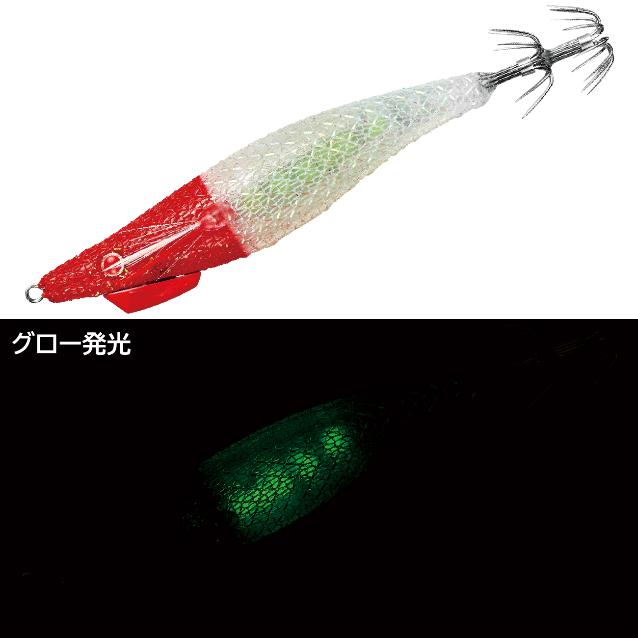 95mmにサイズアップした新エギ型ボディを採用したFタイプエギドロッパーは、エギ型形状ならではの潮受けのよい形状で安定した水中姿勢をキープしつつ、「シルエットによるアピール力」をアップさせています。サイズに対してスリムな形状を採用することで、イカが捕食時に違和感を感じにくく、喰わせとアピールという相反する要素を高次元で両立。さらに、シルエットによるアピール度が高いため、優先的にイカのサイズを上げたい状況にも最適です。