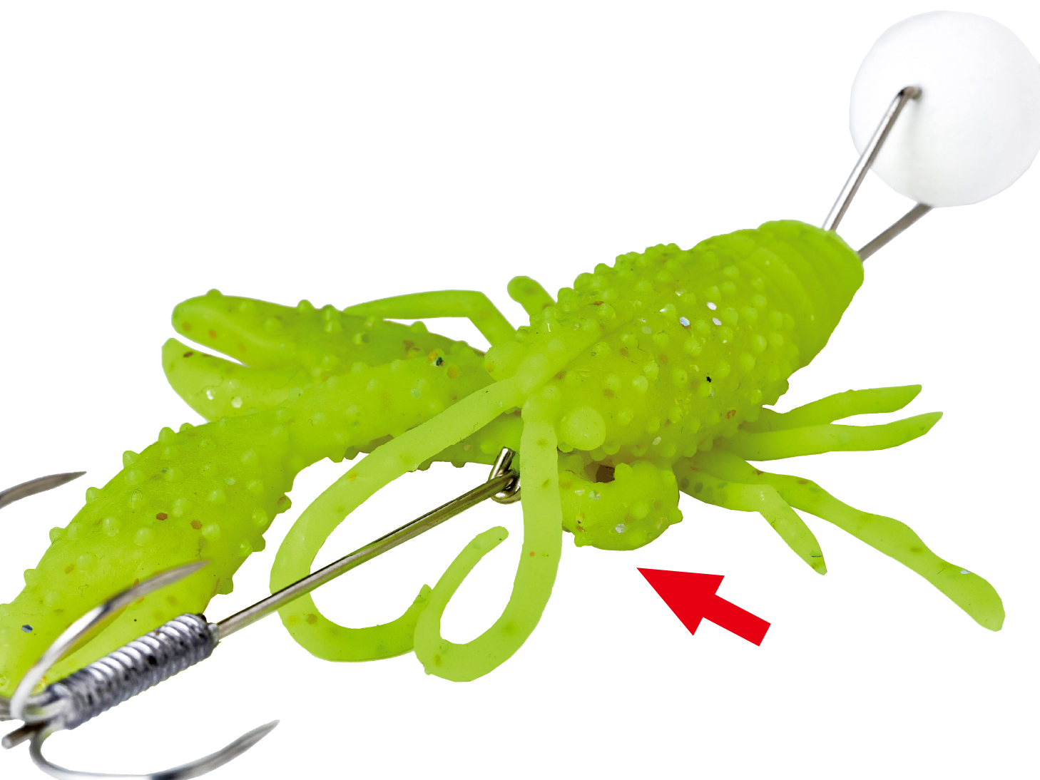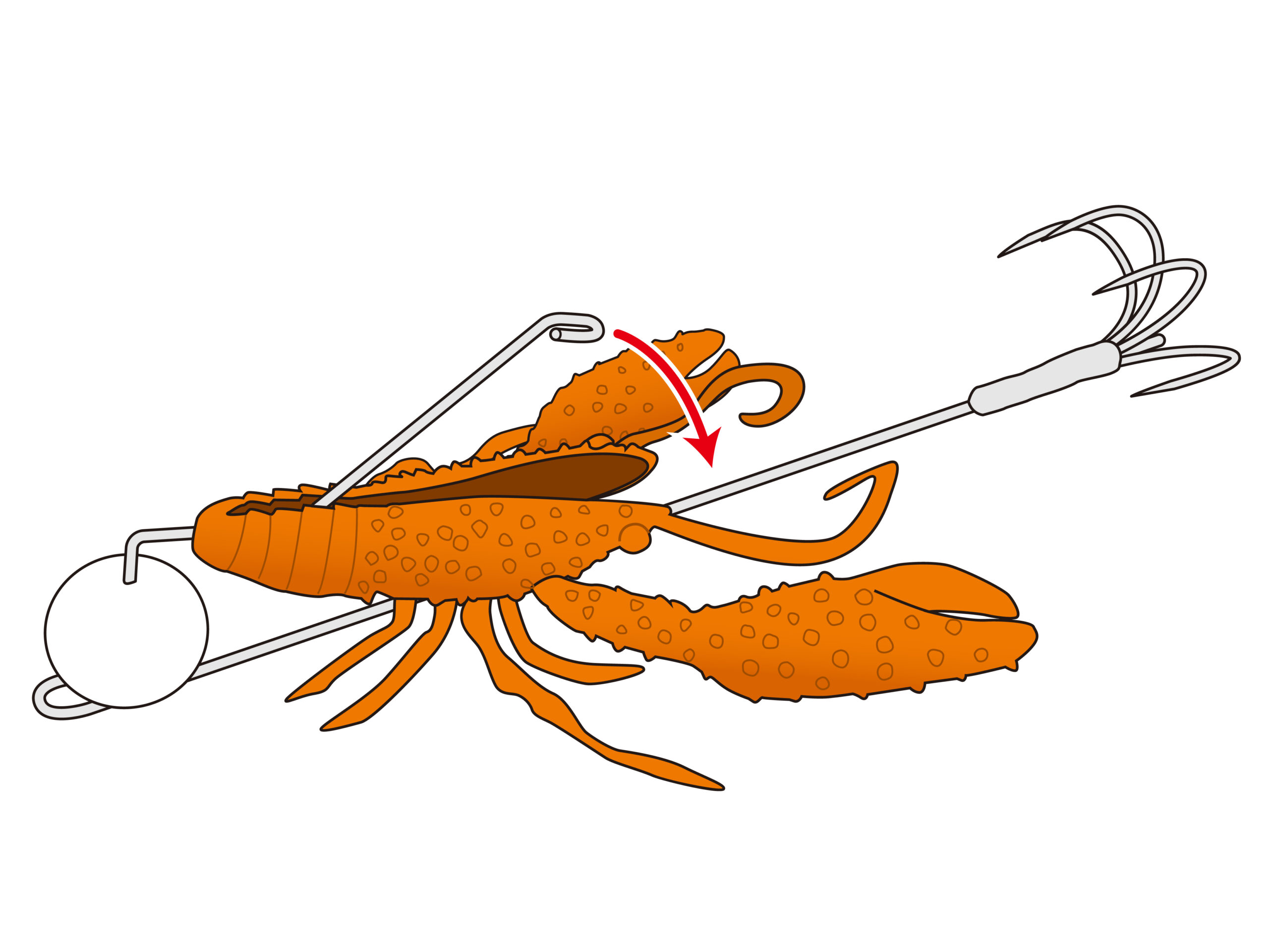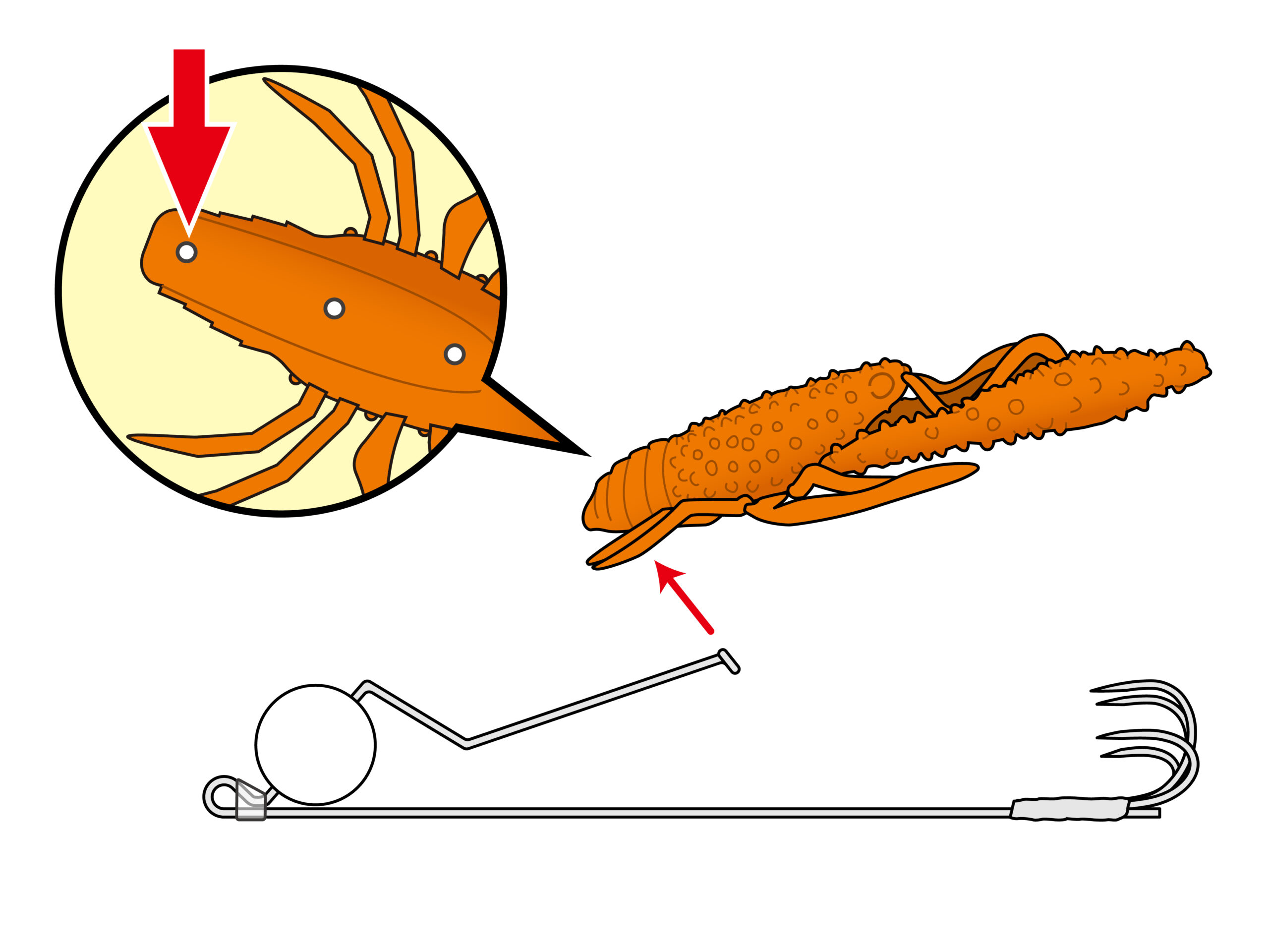 1.シャフトのロックをはずしてワームを取り外します。付替えたいワームの一番お尻側の穴に腹面から背中側にシャフトを刺し通します。