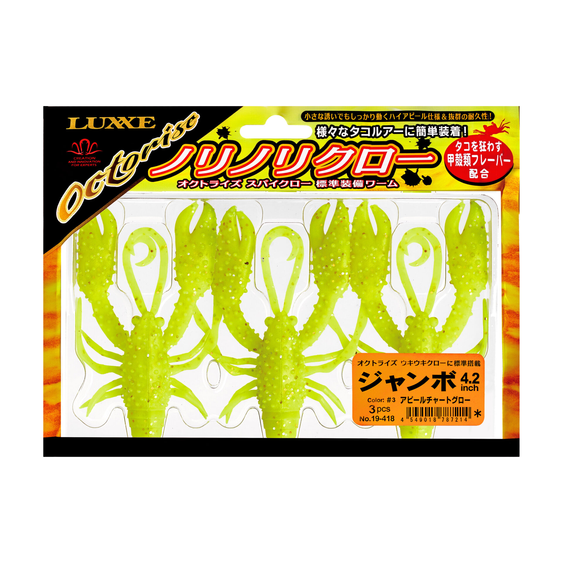 オクトライズ ウキウキクローに搭載。大好評のスパイクローにも搭載可能!高強度エラストマー素材で耐久性はそのままに、ボリューミーな爪と遠くのタコも引き付けるバルキーな体高にくわえノリノリクロー同様タコを狂わす甲殻フレーバー配合でアピール力抜群です。