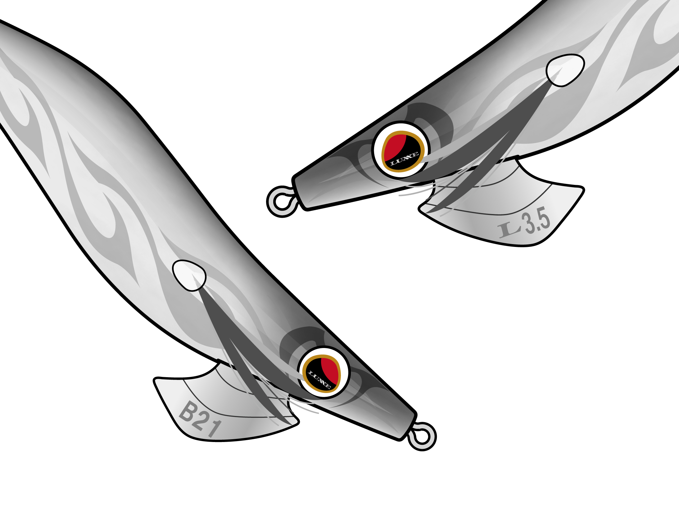 斧(おの)の形をモチーフにした「アックスシンカー」は、適度に水流を受けつつも復元力を持たせた形状。本体の中心軸からできるだけ離れた位置に重心を確保できるよう、シンカー中央部を削り、斧の刃に当たる部分を太く設計することで低重心のバランスを実現。さらに、シンカーの正面を削り、面を持たせたことで、惰性によるムダな移動を防ぐことに成功しました。現場で迷わないよう、シンカーに重量や号数を表記しており、素早いローテーションが可能です。(L3.5はラグゼ3.5号、B21はベーシックモデル21gの意味)。