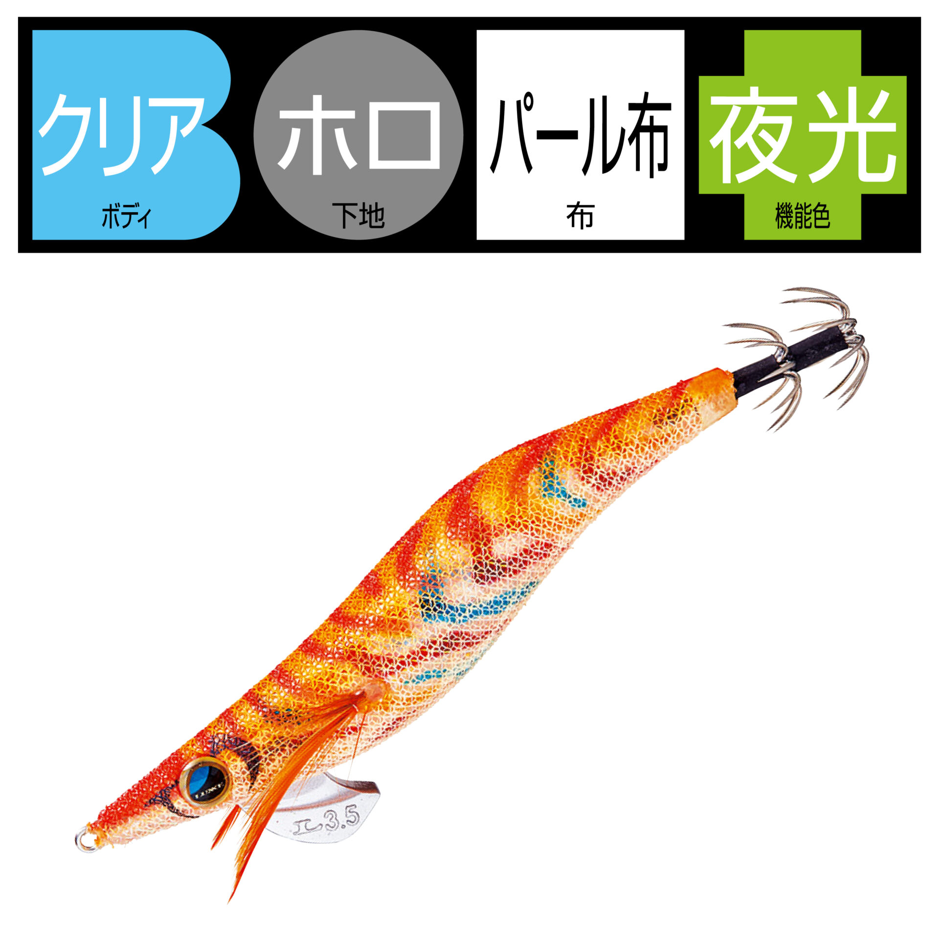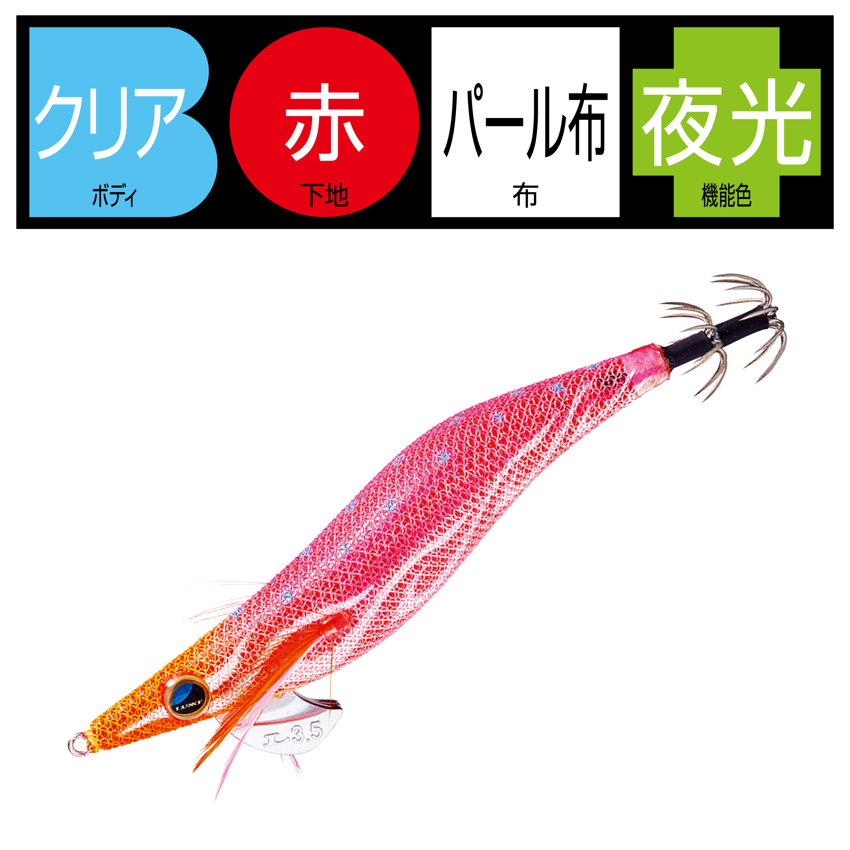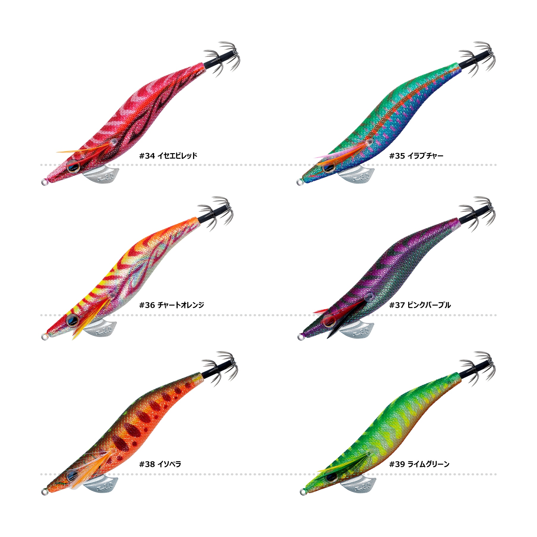 #15 ケイムラアジ#16 ケイムライワシ#34 イセエビレッド#35 イラブチャー#36 チャートオレンジ#37 ピンクパープル#38 イソベラ#39 ライムグリーン#49 ダークグリーンアジ#53 チャリコオレンジ#54 チャリコピンク#58 オレンジマーブル2#59 ピンクマーブル2