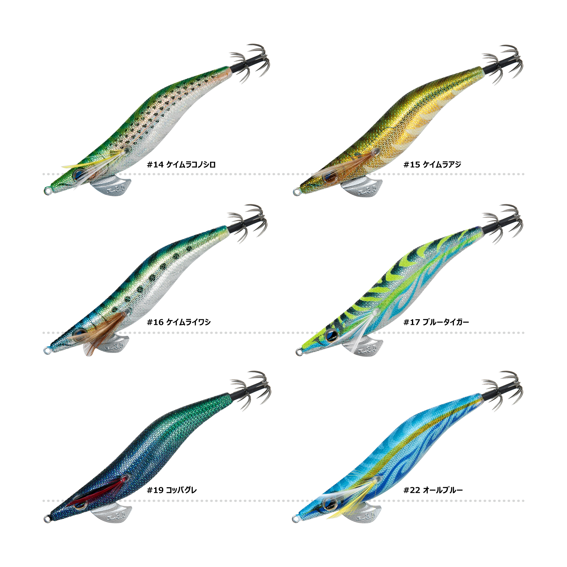 #14 ケイムラコノシロ#15 ケイムラアジ#16 ケイムライワシ#17 ブルータイガー#19 コッパグレ#22 オールブルー#35 イラブチャー#36 チャートオレンジ#37 ピンクパープル#38 イソベラ#39 ライムグリーン#49 ダークグリーンアジ#53 チャリコオレンジ#54 チャリコピンク#58 オレンジマーブル2#59 ピンクマーブル2