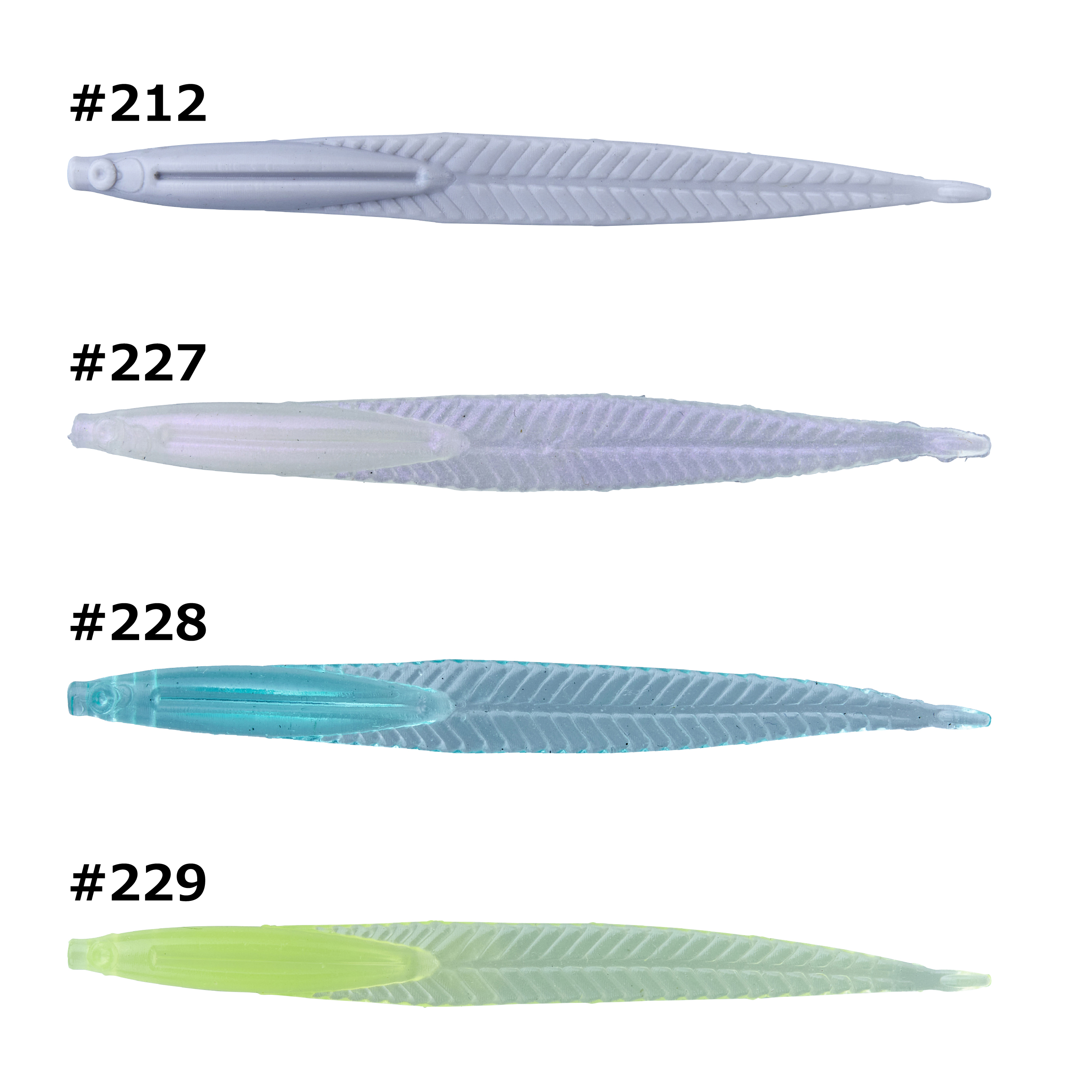 #109 クリアアミグロー#201 ライムグロー#205 パープルネオンUV#209 一撃チャートUVブルーラメ#210 オキアミグロー#211 クリアUVシルバーラメ#212 クイーンオブザブルースグロー#227 スモーク#228 アイスブルーUV #229 クリアチャートUV