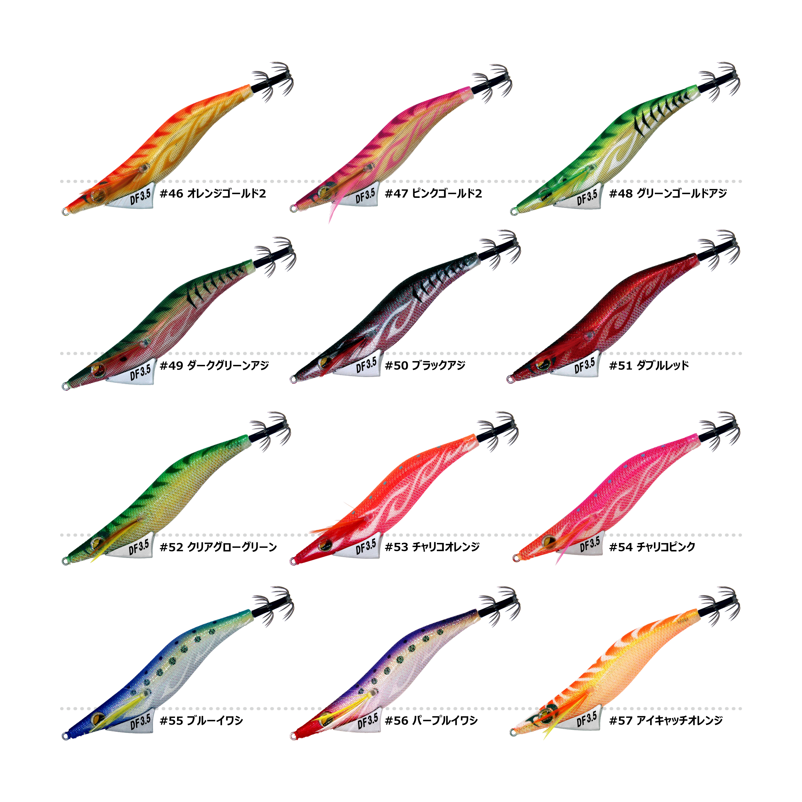 #46 オレンジゴールド2#47 ピンクゴールド2#48 グリーンゴールドアジ#49 ダークグリーンアジ#50 ブラックアジ#51 ダブルレッド#52 クリアグローグリーン#53 チャリコオレンジ#54 チャリコピンク#55 ブルーイワシ#56 パープルイワシ#57 アイキャッチオレンジ