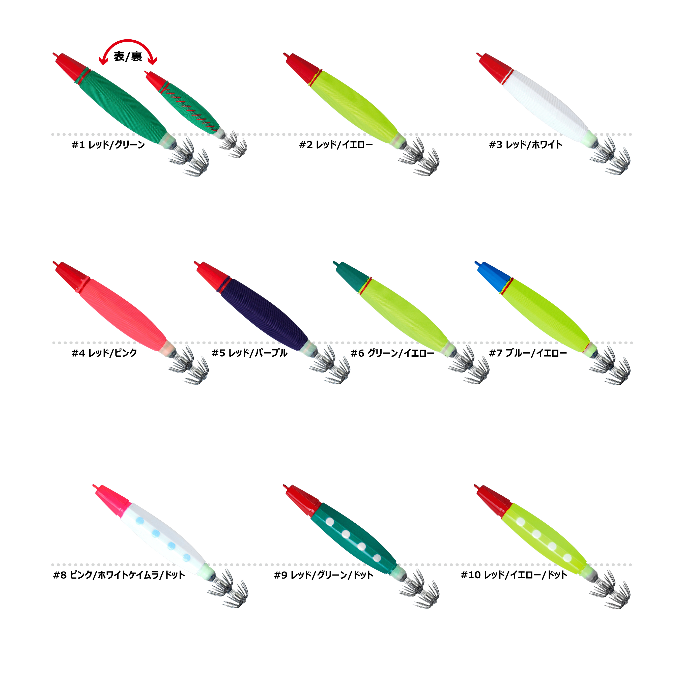 #1 レッド/グリーン#2 レッド/イエロー#3 レッド/ホワイト#4 レッド/ピンク#5 レッド/パープル#6 グリーン/イエロー#7 ブルー/イエロー#8 ピンク/ホワイトケイムラ#9 レッド/グリーン#10 レッド/イエロー#11 ピンク/ブラック#12 レッド/オレンジゼブラ#13 ピンク/ブルーグローゼブラ#14 レッド/ブラックゼブラ#15 ブラック/ポルカドット#16 G-SPECIAL ケンサキ