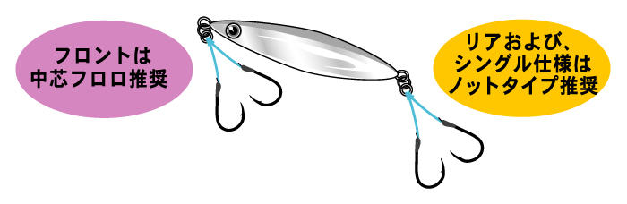 水中でアピールすることをコンセプトに設計されたオリジナルアシストライン!水中で色が通りやすいと言われる可視光線480nm付近にカラーチューニングを施したアシストライン。ジグ本体と同じように、アシストラインもシルエットの一部としてターゲットにより強くアピールすることで、魚の反応距離を伸ばすことが可能。すなわち、より遠くの魚にアピールすることが可能となる、全く新しいコンセプトからデザインされたアシストラインです。中芯フロロ入り、ノットタイプの2パターンで様々なアシストフック作成が可能です。