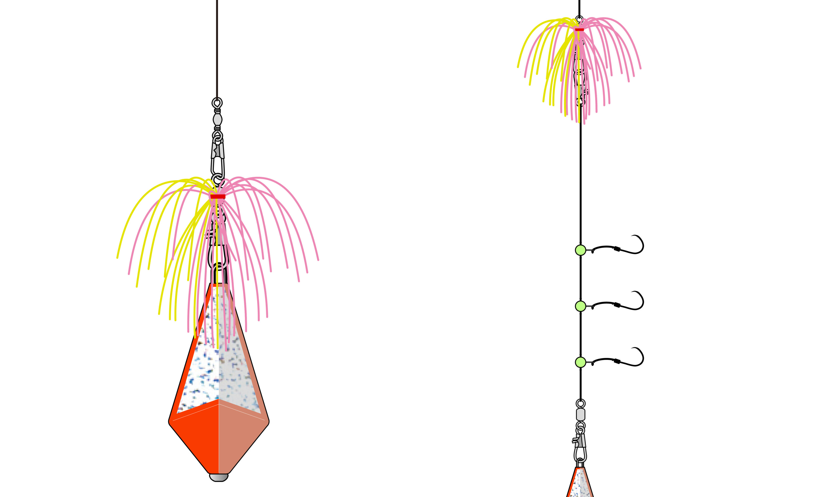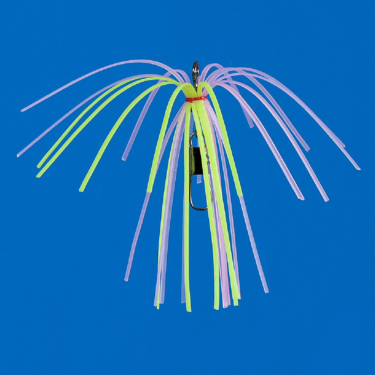 シリコンスカートが水中で花火のように舞い、視覚と波動でカワハギの心を捕えます。カワハギはもちろん、アイナメ、フグやカレイ、キス仕掛の天秤部にセットするなど、魚種も使い方もあなたのアイデア次第。