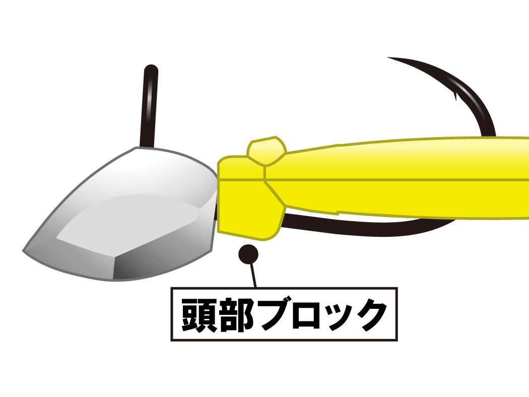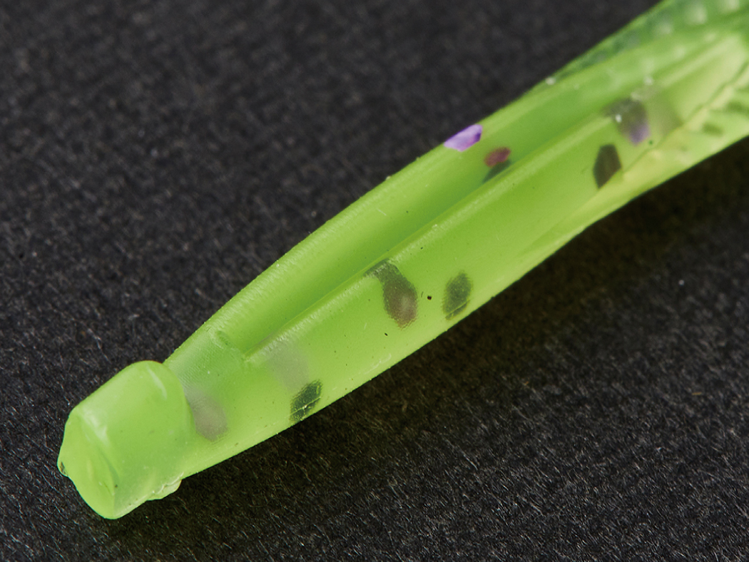 ワームの下側にスリットを設けることでカンタンにまっすぐフックにセットできる「Q.S.S.(Quick setting slit)構造」。バイト時にワームが折れ曲がる事で吸い込みもアシスト!フッキング時にも効果があり、ワームボディーが前方にスライドする事でフックが露出し、バラシを軽減します。