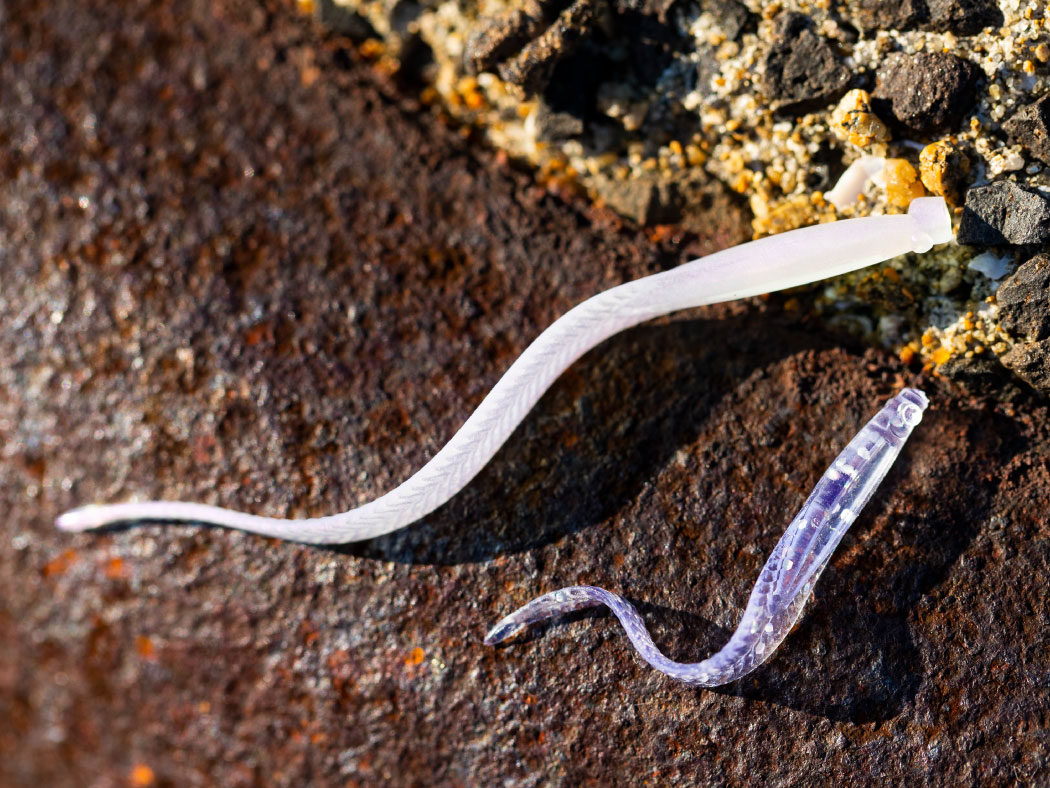 ワーム頭部のブロックを貫き、外に出した鈎先を本体のスリット(溝)から再び刺し込みます。