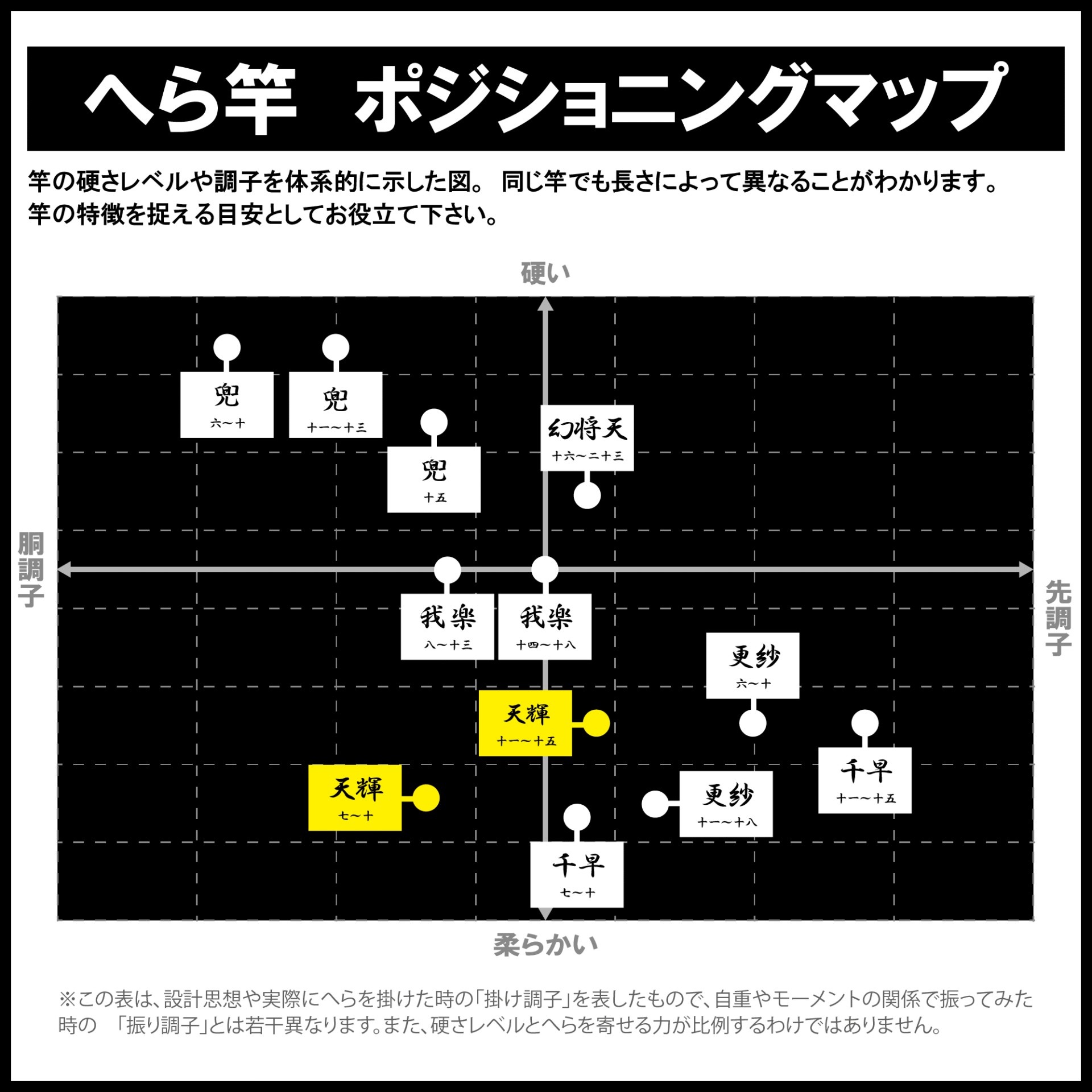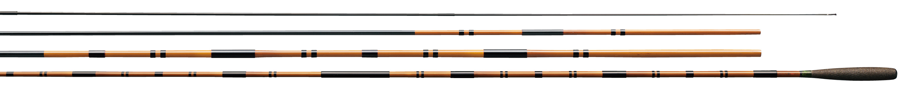 従来の概念を払拭し、継数を増やすことで実現した中硬式胴調子。中硬式という中間的な硬さでありながら、それ以上の力を秘めた調子です。竹はカーボンよりはるかにやわらかい繊維構造を持っていますが、大型べらでもじわりじわりと浮かすことのできるトルクを秘めています。その秘密は竹の節にあります。節があることにより、竹の断面が楕円に潰れようとするのを防ぎ、パワーを発揮できるのです。そこに着目し、天輝は継数を増やすことにより、硬さを出すことなく、パワーを引き出しています。また、超低弾性カーボン~高弾性カーボン、グラスなど多種多彩な材料を細かく使い分けることによりパワーだけでなく、美しい曲がりと粘りを発揮。特に、穂先と穂持ちが飛躍的に進化しました。従来では、「穂先」という1本のセクションのみで繊細さとパワーを両立させなければならなかったのですが、これを2つに分けることにより各セクションの役割をさらに強調できるように設計しました。また、ノイズフェーダーを採用することで、タタキや細かな振動を極力抑えます。これによりカーボンロッドの最大の弱点を最大限緩和し、心地よい使用感を実現。さらに、PCS(パワークロスシステム)を採用することによって、振り込みやへらを寄せる際のブレを極力なくしています。