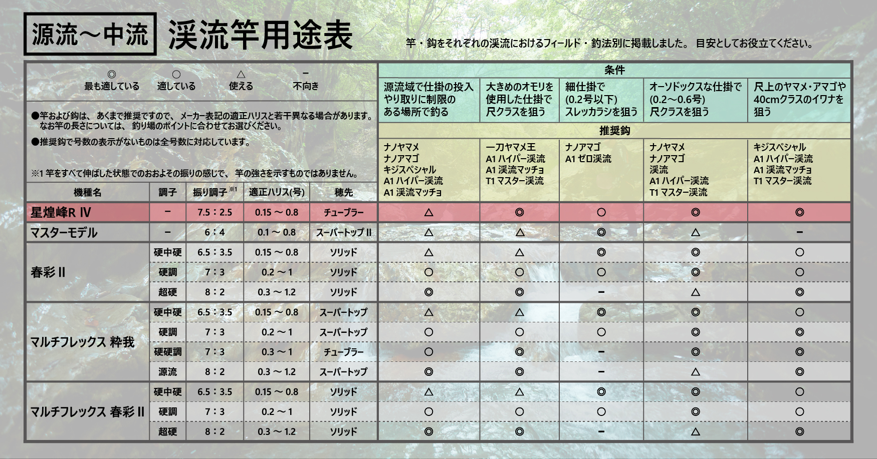 小継渓流竿は片手振りを基本とした操作性が必要とされる軽量な竿です。その一方で、軽さだけではなく振込に耐えうるバランスと強度、尺上のパワフルな疾走を川の流れの中でしっかりと止めきるパワーが必要です。そこで、軽さ・強度・パワーの3要素を高次元で融合させるために、がま渓流では唯一、素管を構成する材料の大部分に長尺の鮎竿に使用される超高弾性カーボンを採用しています。また、一方で強度に優れる高強度材料を適材適所に配置。それにより、片手で楽に振れる操作性を実現しました。小型の数釣りはもちろん、尺上までしっかり抜けて不意の大物でもしっかり弱らせ取り込むことが可能な竿に仕上がりました。振込性能と感度性能も驚愕のレベルです。実釣テストでは、解禁当初の数釣りを細糸でこなしつつ、しっかりと尺物の引抜性能も確認。盛期の50cmクラスのニジマスを0.4号という細仕掛でキャッチした実績もあります。素管性能を飛躍的に向上させた4代目星煌峰の誕生です。