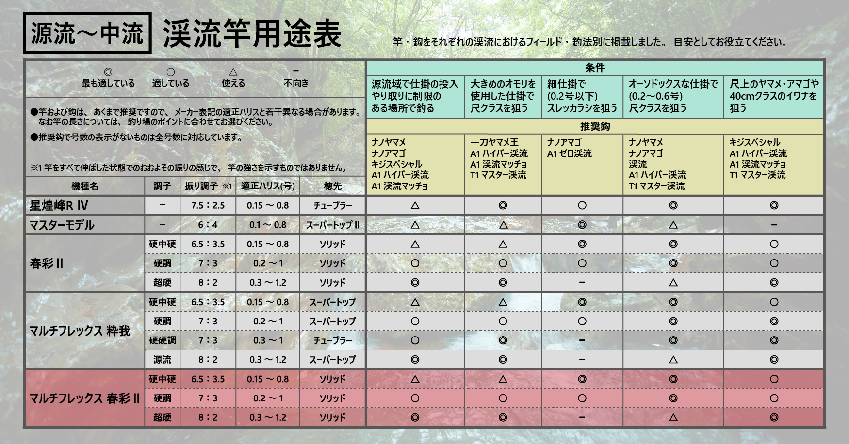 調子毎に竿の継番を個々に分析しより軽快に渓魚にアプローチできるようにテーパーやマテリアルを最適化し、張りと粘りを両立させました。そのことで、操作性と感度に優れ、仕掛の投入の際や魚が掛かればしっかりと負荷に応じて竿が曲がり込みます。中流域から上流部でオールマイティに活躍できるモデルです。マルチフレックスシステムを採用しているので、ポイントにあわせて3段階に長さが変えられます。穂先のリリアンを金属トップに進化させていますので、渓魚の繊細なあたりも逃しません。