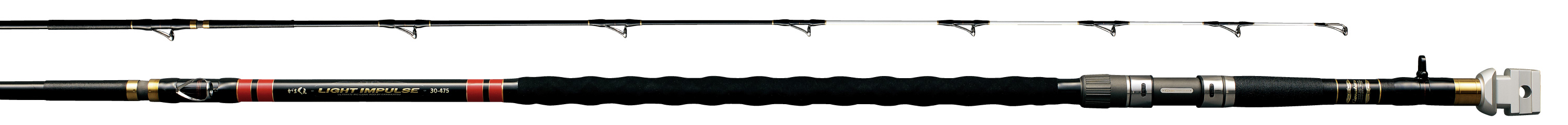 15kgクラスのクエをメインターゲットに開発した、豪快さと軽快さを兼ね備えたスペシャルロッドです。穂先のしなやかさにより違和感なく対象魚にエサを喰わせることができ、魚が掛かれば胴部分のパワフルな粘りで魚をいなして浮かせます。手持ち・固定の両方のスタイルに対応可能です。手持ちスタイルでは大型魚の突っ込みに対してそのパワーを遺憾なく発揮し、固定スタイルの場合しなやかな#1~#2部分が警戒心の強い魚に違和感を与えません。両スタイルへの対応を可能にするため新型アルミマシンカット石突を採用しています。