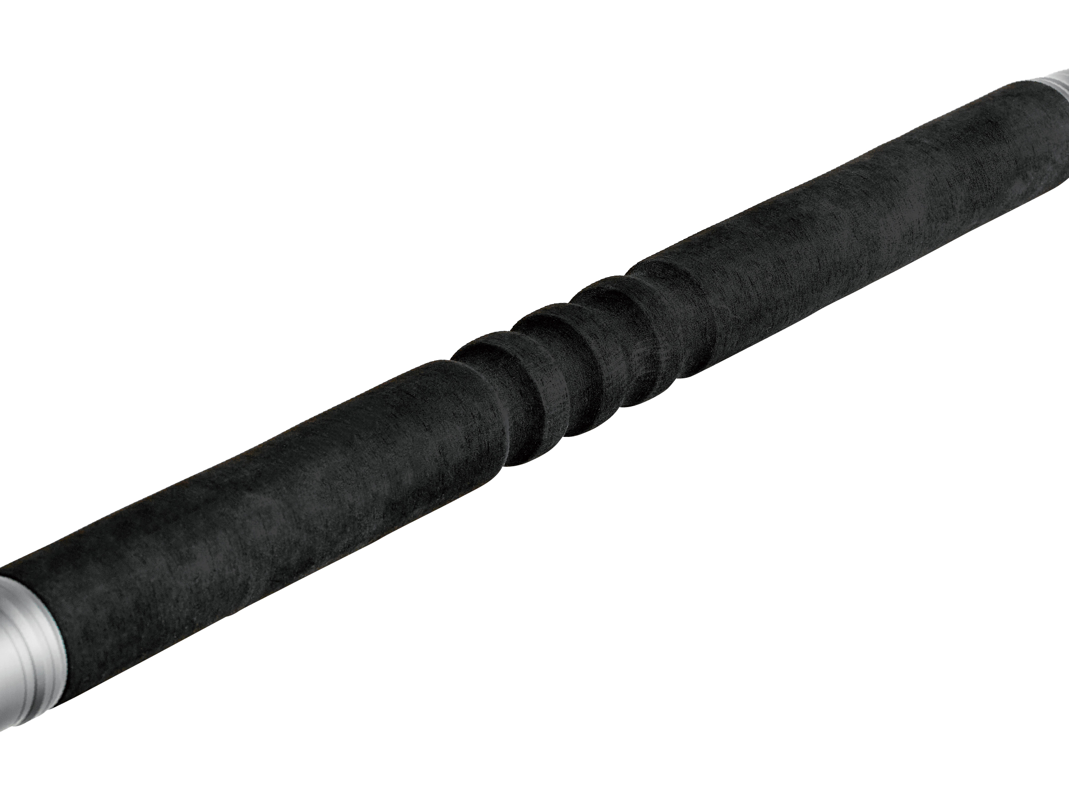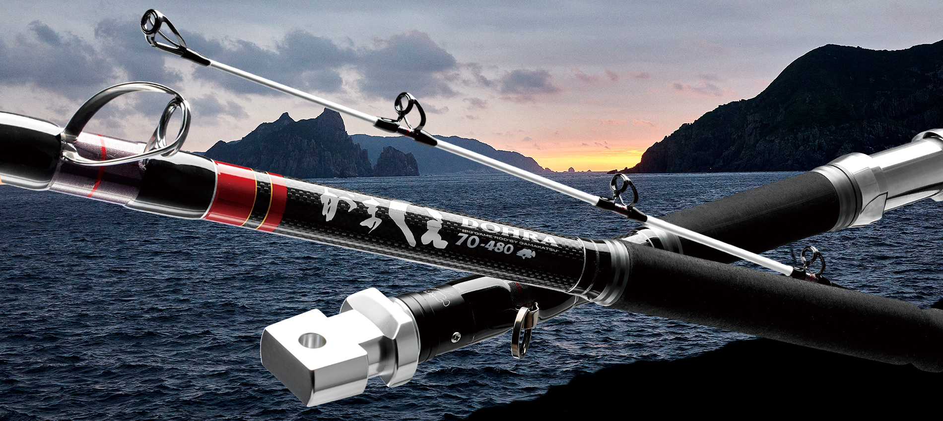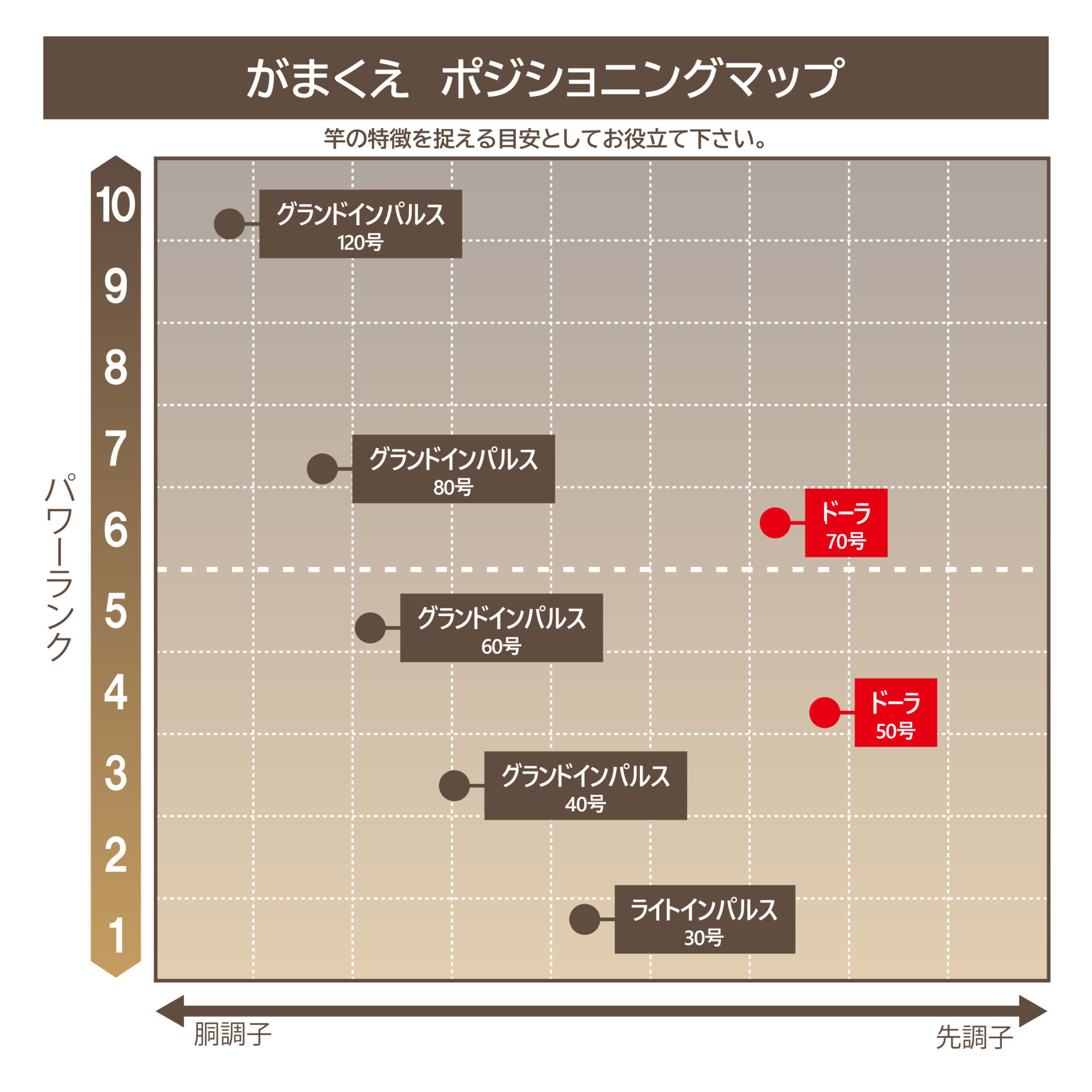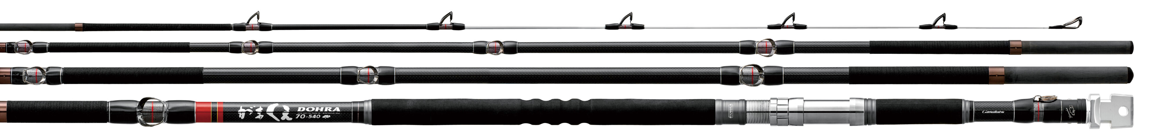 磯釣り究極のターゲットであるクエ。その巨躯から放たれるパワーは暴力以外の何者でもない。そのパワーを真正面から受け止め、根や巣穴への突進を食い止める事がクエ竿には求められる。だが、あれほど暴力的な走りをみせるクエも、ひとたび喰い渋ると意外なほど神経質で、ただ強いだけのクエ竿では喰い込ませることができずアタリだけで終わってしまう。そこで、”がまくえ ドーラ”はクエ竿としての強さを残しつつ穂先の柔軟性にこだわった。仕掛投入や操作に影響がでない強度を確保しつつも、喰わせることを重視した柔軟な穂先に仕上げる事で、クエが餌をくわえた際の違和感を減らし、自然に喰い込ませるようにした。無論、喰い込み性能だけが特徴ではない。強度を確保すべく肉厚としたブランクを並継で継ぎあわせることにより隣り合うブランクに明確なパワー差を設け、曲がりが移行すると共に魚を締め上げる。食い込み直後の突っ込みから抵抗を許さず、根に潜られる隙を与えない。また、継番毎に適切なテーパーデザインを行うことで繊細な穂先から元竿へとスムーズに荷重を伝達し、餌をくわえ込んだクエが夢中になって走り、その走りにあわせてどこまでも舞い込み、そして、受け止め、浮かせる。質実剛健をコンセプトに生まれたがまくえドーラは黒とカーボンを基調としたシンプルで力強い意匠となっており、熟練の底物師はもちろん新参の若きクエ釣り師であっても違和感なく所有できるだろう。クエ竿に求められる実釣性能に忠実に、間違いなく使える物として作り上げた。10㎏以下のクエを取りこぼすことなく、20㎏オーバーをパワーで制し、あるいは、暴力的なパワーで知られるカンパチなどの大型回遊魚を捻じ伏せる。そんな巨魚との対峙にがまくえドーラは良き業物となるに違いない。