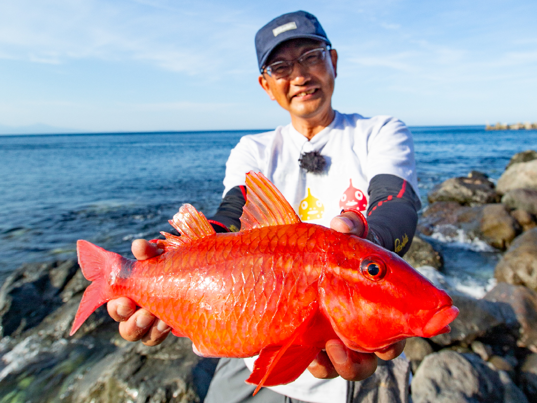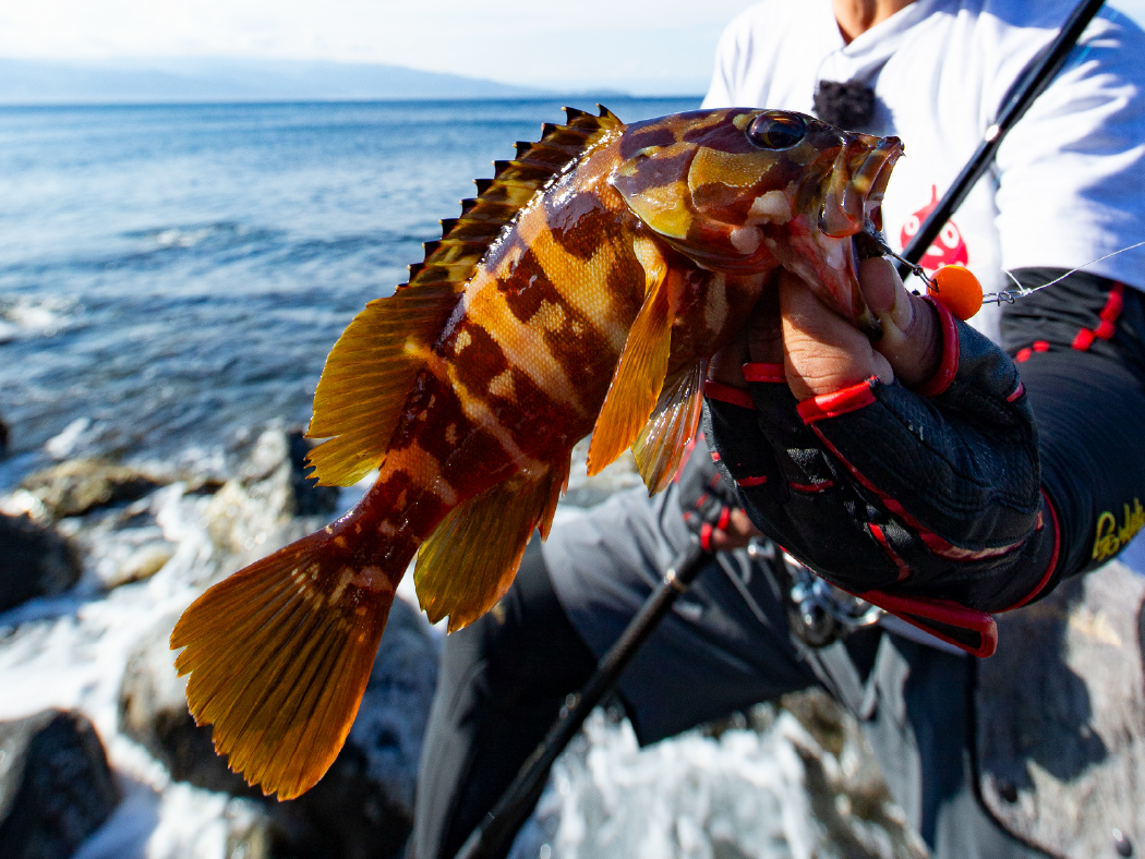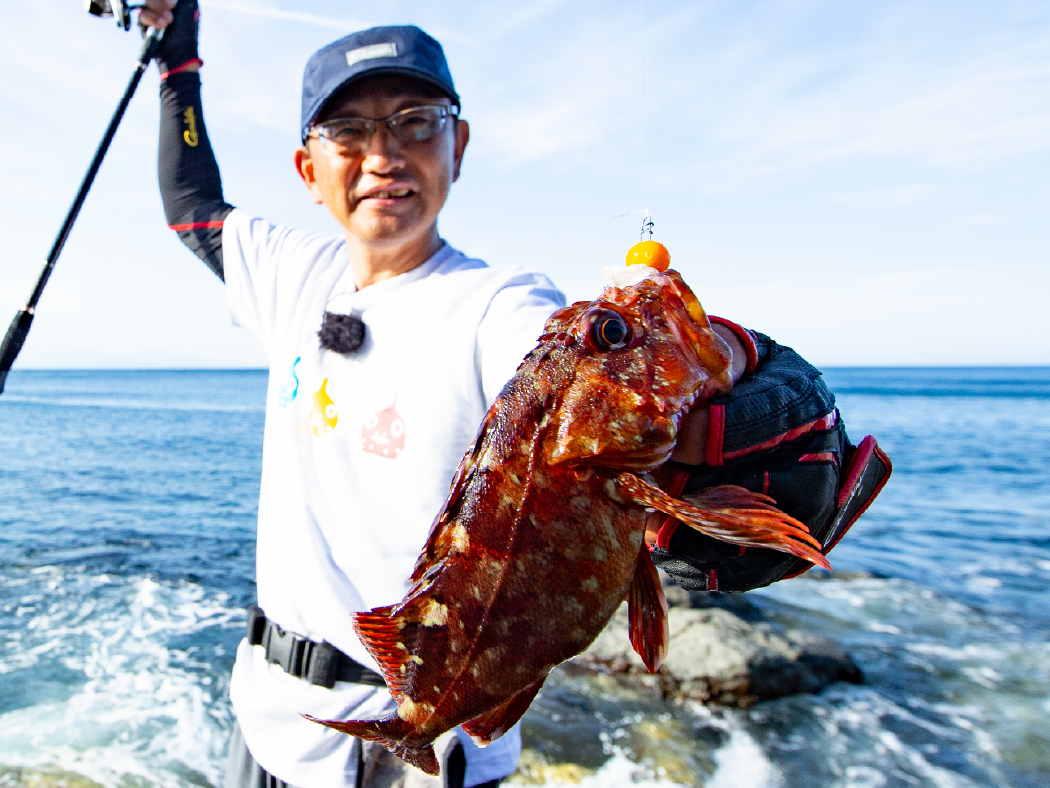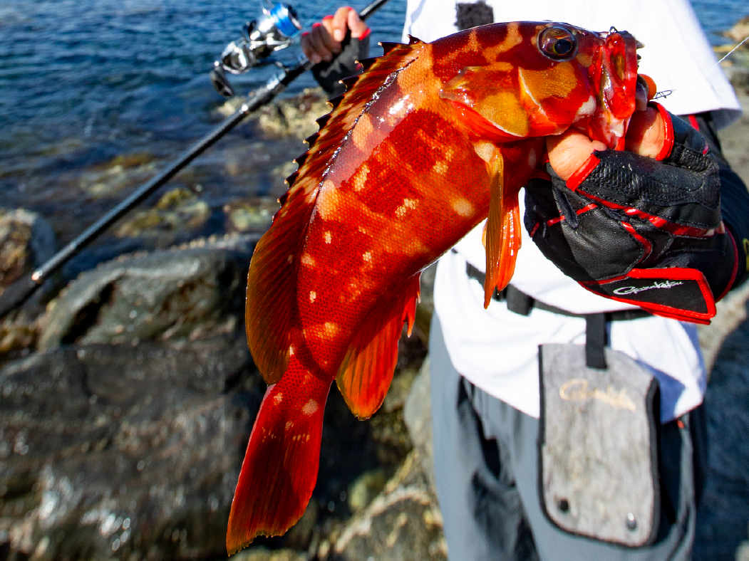 ゴロタ浜はカサゴやアカハタはどの根魚も豊富。スマートサーフは飛距離が出るので沖の手つかずのエリアから良型を引き出すことができる。