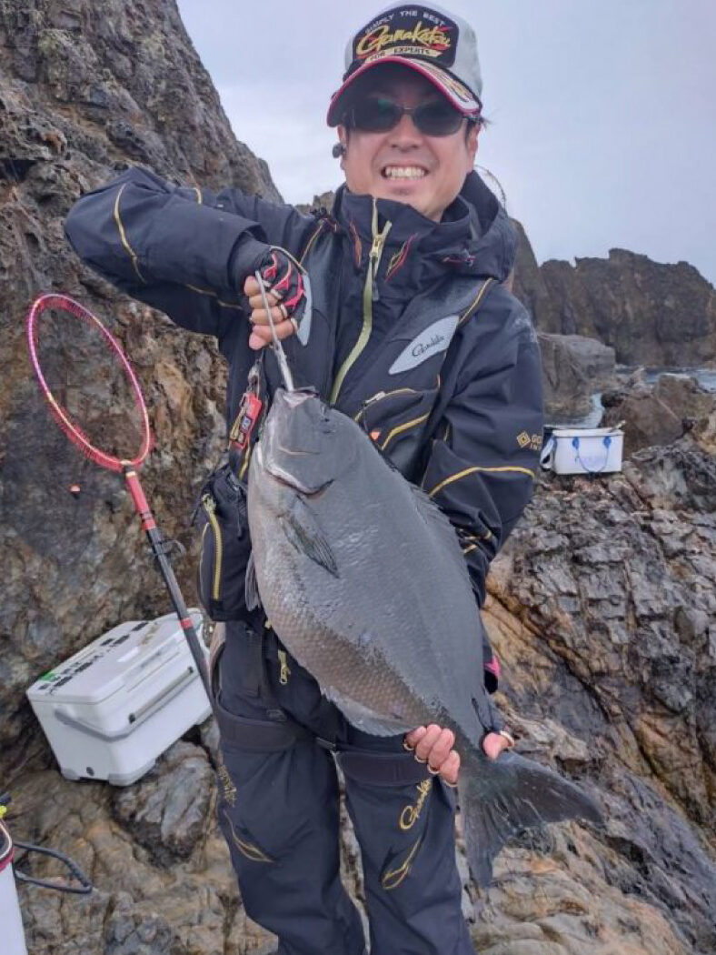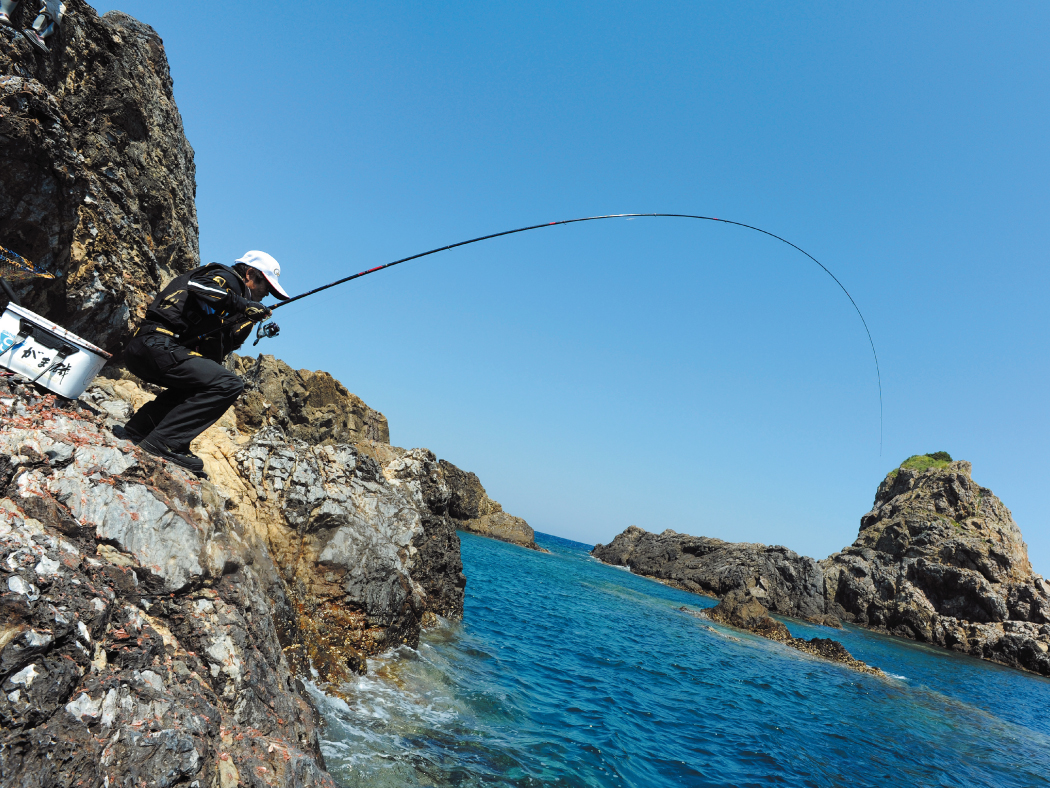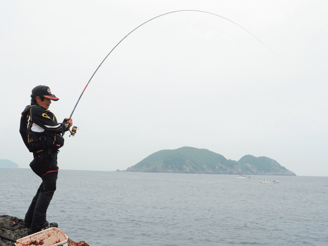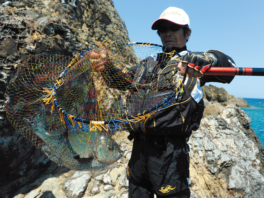餌取のウスバハギとイスズミをマキ餌ワークでかわし、狙いを絞った尾長の口先にサシ餌を誘導。ウキが風の影響を受けないように極小ジンタンを仕掛に足してヘッドがやや沈むようにセットしたのが功を奏した。デカ尾長の激震んとらえ、足元のシモリをロッドワークで交わす。これもバットが粘り強い竿だからこそできることだ。