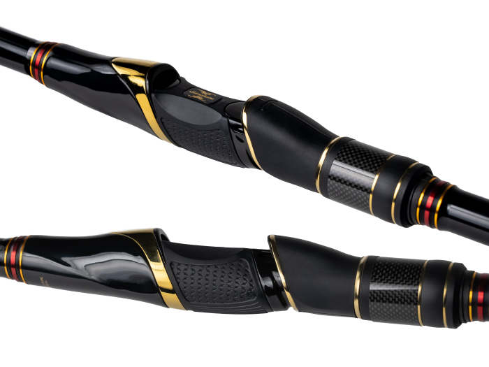竿は細身にすればするほどねじれに弱いという細身設計の弱点を、PCS(パワークロスシステム)によるねじれの抑制で見事に克服。強い負荷がかかった際でも竿がブレることなく魚の引きを受け止めながら美しくあしらうことを可能にしました。また、胴調子の竿にありがちなダルい振り感も、「TORAYCA(R)T1100G」カーボンを使用することで竿ダレが少なく、比較的操作しやすい竿に仕上がっています。そして何より、「TORAYCA(R)T1100G」の最強の強度によって限界まで細身にすることが可能となり、非常に粘り強い調子に仕上がりました。リールシートは全機種スクリューシートを採用。リールをがっちりと固定できます。手に触れるフード部分はゴム素材を採用し、滑りにくくしっかりと握れます。
