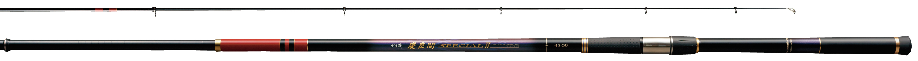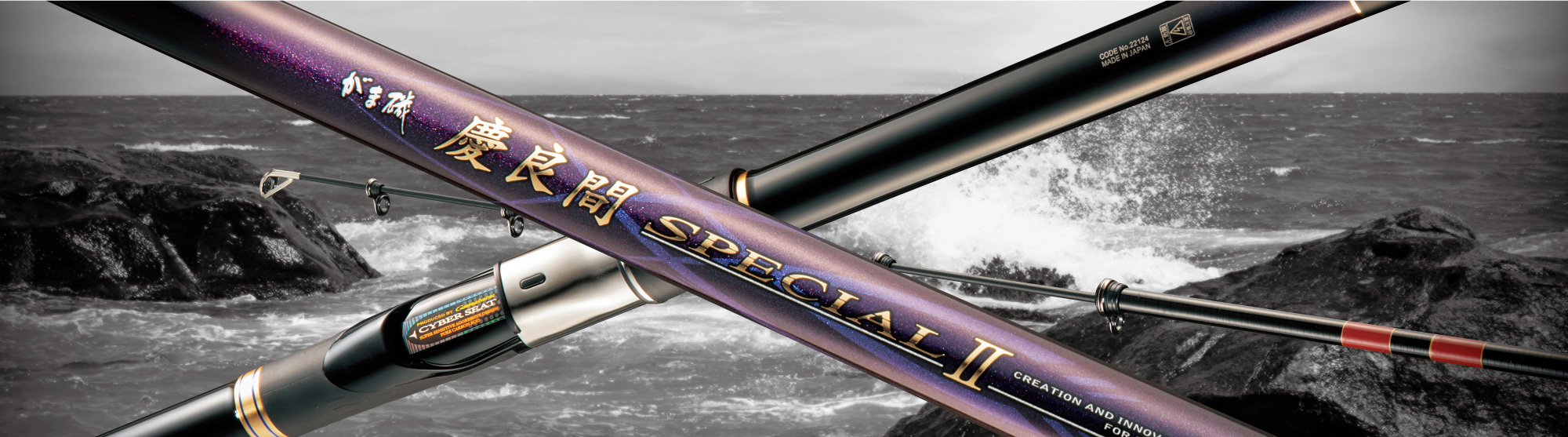キビナゴをエサに使ったスルスルスルルー釣法にて大型魚を攻略するためのロッドです。最強クラスの強度を誇る「TORAYCA(R)T1100G」カーボンを採用したことで、圧倒的なパワーの剛の要素に粘りの柔の要素を融合しました。そのことで、大型魚の暴力的な引きに対しても、竿が粘り込むことで、やりとりの際の竿の角度が保ちやすくなり釣り師への負担を軽減します。それでいて、強引なやりとりが必要な場面での圧倒的な胴のパワーも健在です。太いラインに対応するよう穂先のガイド径をトップガイドから誘導ガイドのすべてにおいて1ランクサイズを大きくしていますので、仕掛けの投入や道糸を送る動作や魚とのやりとりに至るまでよりスムーズに行えます。強烈な引きにも安定したやりとりができるよう、ホールド性に優れるラバー付スクリューシートを採用しています。また、腹当てファイト用にラバー尻栓を採用しました。