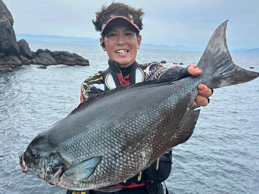 最もデカ尾長を釣る男、西森は「59cmかな、1.75号のロングスペシャルで釣ったけど、取り込みに入ったときにあしらいやすくスーッと寄ってきた感じやね。それとこのエリアは風が強いことで知れてるけどそんなときに有利に釣りができるね、海面に竿先を浸けてラインを操作できるからね。足場が高いポイントでもメリットがあるよ」 と。西森にとって、当たり前のサイズ。だがテストには十分過ぎる。