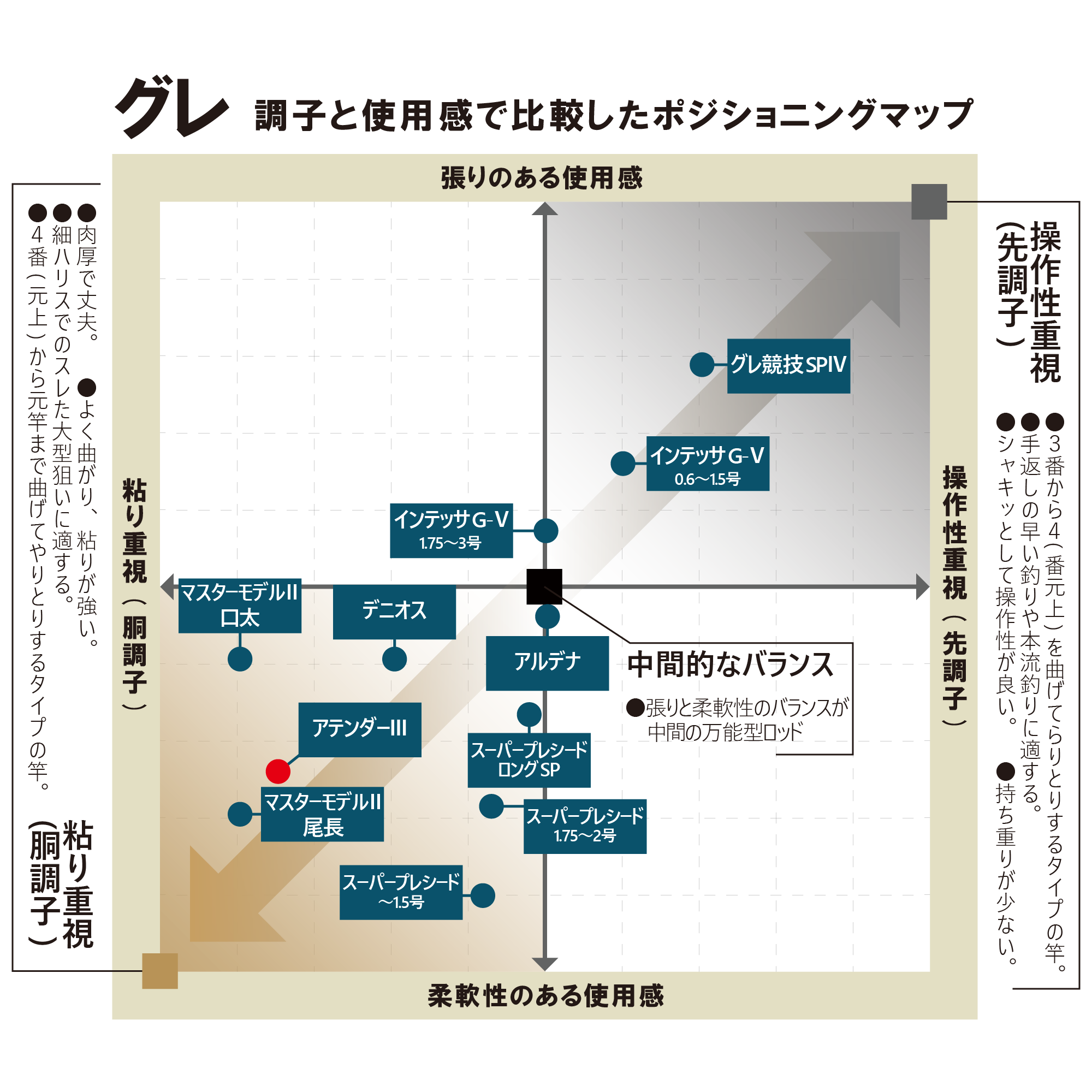 40㎝クラスの口太グレを狙うのに最も適しています。先短設計によって操作性が大幅に向上し、精度が求められるシビアな状況でも緻密な攻めが可能になります。ウルトラアクティブサスデザインによるスムーズな支点移動で50㎝オーバーの大型の引きにも十分対応できます。