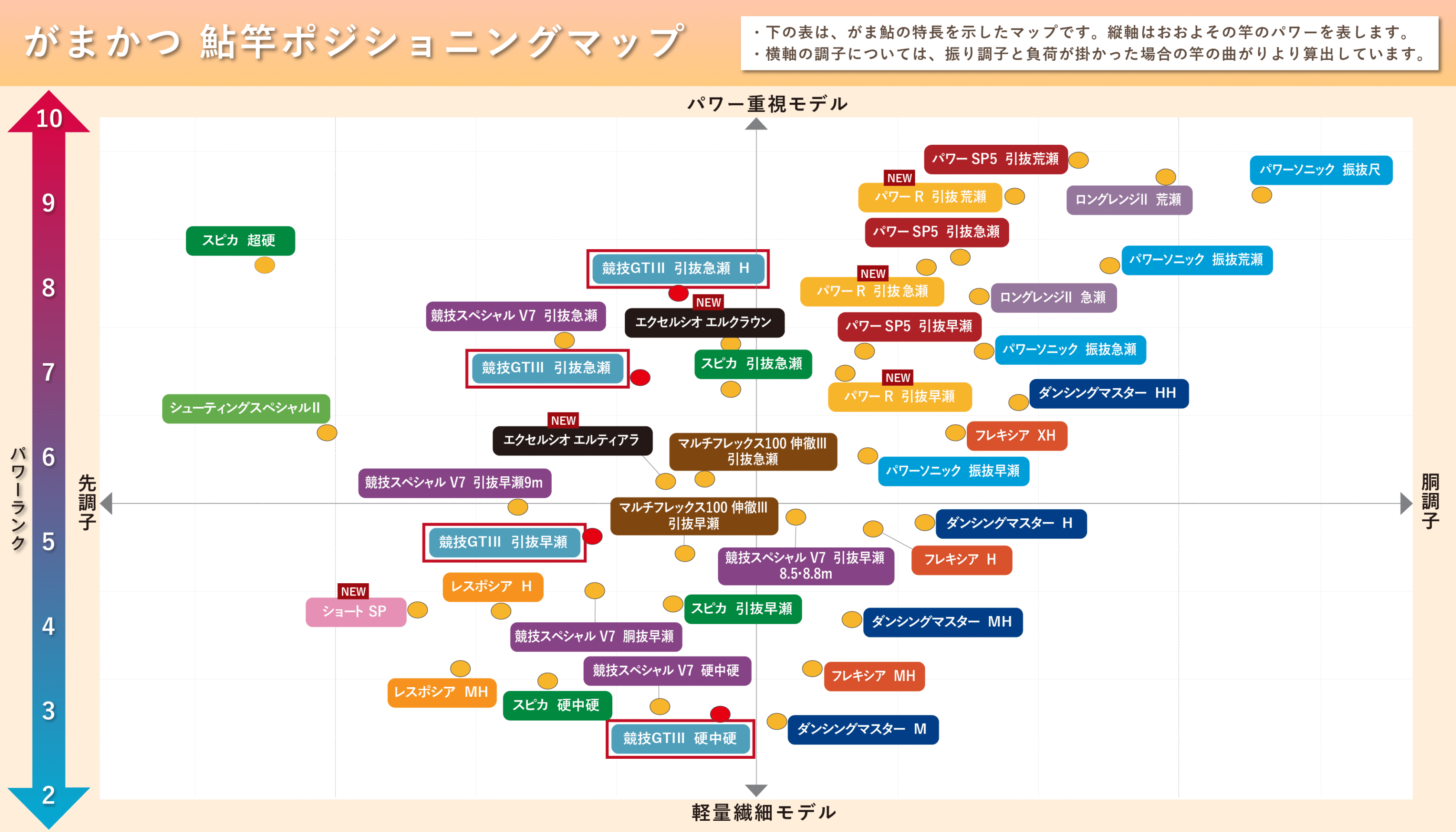 高弾性高強度のTORAYCA(R)M40Xカーボンを採用し、シリーズを通して竿先を軽量化したことで、競技系ロッドに求められる大事な要素の1つである操作性が抜群の仕上がりとなっています。また、標準装備で各調子に最適な「硬中硬には繊細タイプ」、「早瀬には万能タイプ」、「急瀬にはパワータイプ」のチタン穂先を採用することで、研ぎ澄まされた感度で水面下の状況を的確に知ることが出来ます。3タイプの調子をラインナップしており、それぞれの調子に合わせた最適な竿の張りと粘りのバランスで、様々な状況に高次元でしっかりと対応できる競技系ロッドです。
