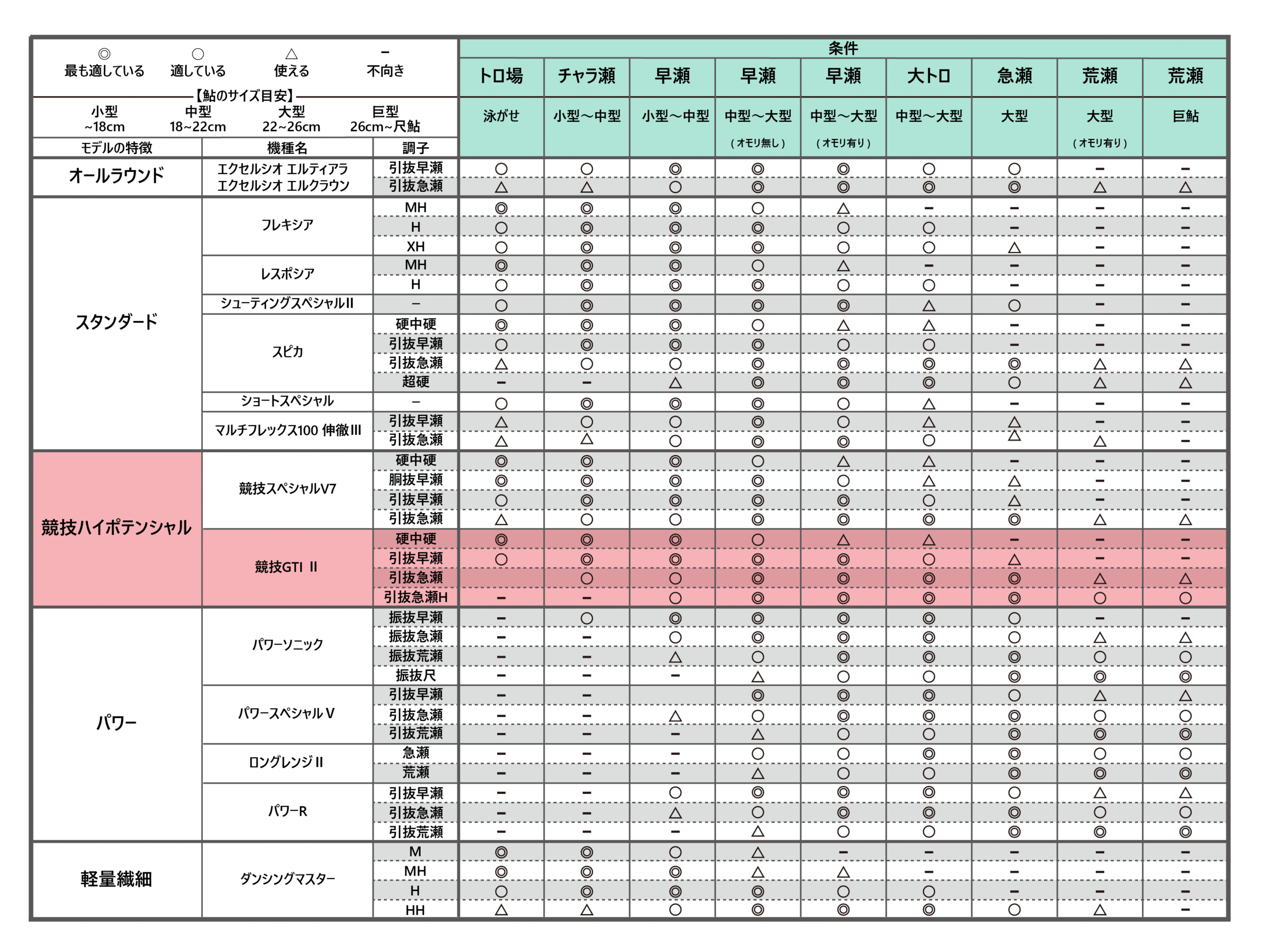 特に野鮎を掛けるまでに重点を置いた調子。竿全体を柔軟に仕上げているので、オトリ鮎を浮かせずに常に野鮎に追われる体勢を作れます。小型のオトリや弱ったオトリを使用した際でも流れの中でしっかり泳がせることができます。柔軟な調子は掛かり鮎のバレも極力防ぎます。それでいて、ある程度のパワーも兼ね備えていますので、23cmクラスまで対応できます。繊細系万能モデルで、競技会が盛んに行われる初期から中期に適しています