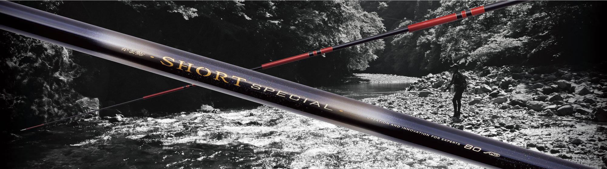 取り回しがよく、一日中竿を手にしていても疲れ知らずのショートロッドです。竿が短いからこその軽快な操作性や正確なオトリ操作、臨場感のあるやり取りなど多くのアドバンテージがあります。小規模河川の攻略に最も使いやすい引抜早瀬クラスのパワー設定にしており、調子としては操作性に優れる先調子設定で、鮎が掛かるポイントが点在する上流域で特に活躍します。使用感としては引抜早瀬に先調子の要素をプラスし、パワーはそのままに操作性を向上させました。野鮎を掛けるまでは操作性に優れますが、掛かるとしっかりと曲がり込むのでバラシにくく余裕を持って対応できます。また、超高弾性カーボンを適材適所に使用することで、上位クラスのバランスの良さを実現し、短さも相まって正確なロッド操作が実現可能です。