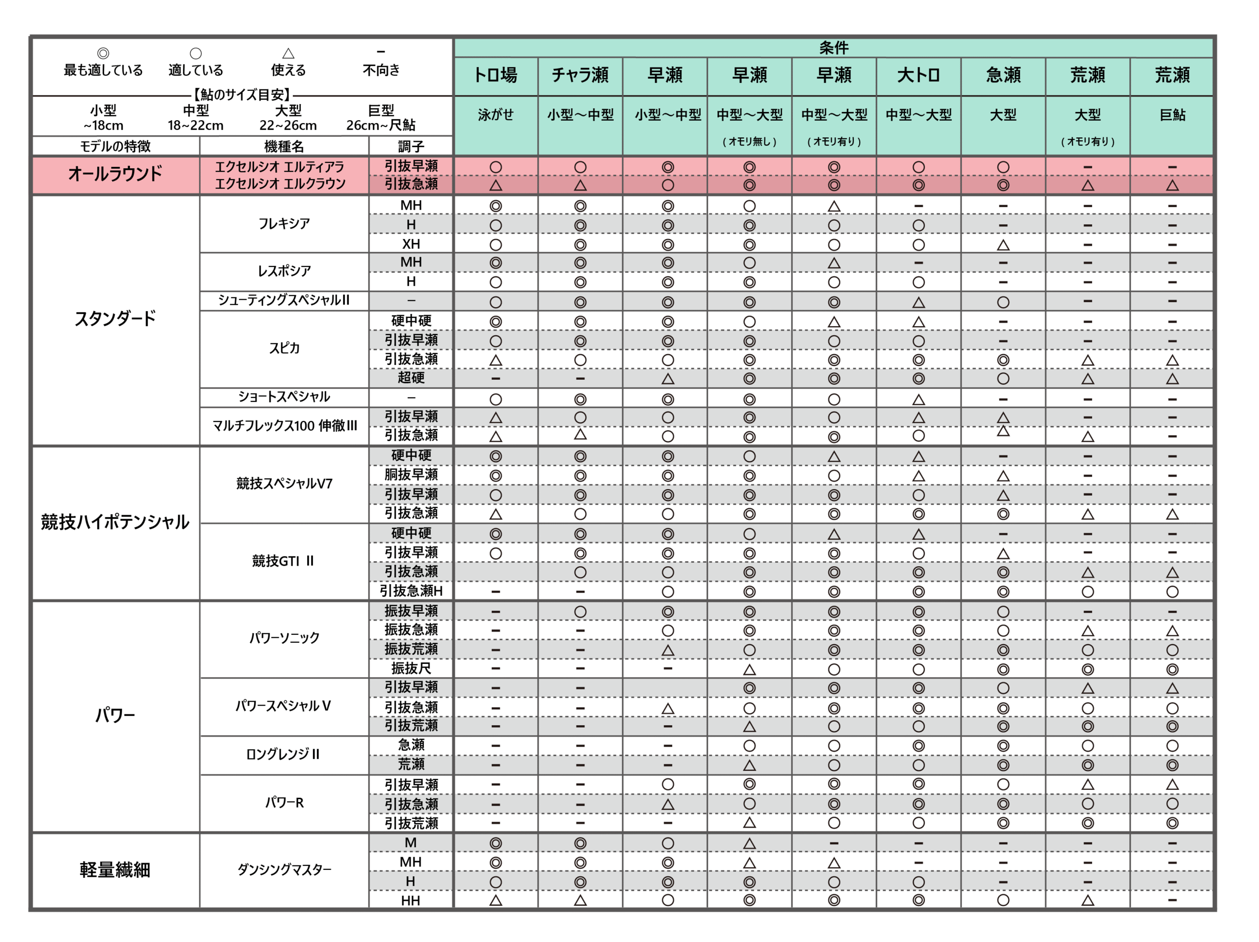 瀬や大鮎を攻略するための要素を高次元で搭載したモデルです。特に瀬でのオトリ鮎の操作性を向上させるために、竿先の張りと柔軟性のバランスにこだわりました。背鈎やオモリを使用した場面でも超絶感度を誇り、野鮎が掛 かると粘りとパワーでバレを防ぎつつ一気に浮かせ取り込むことができます。