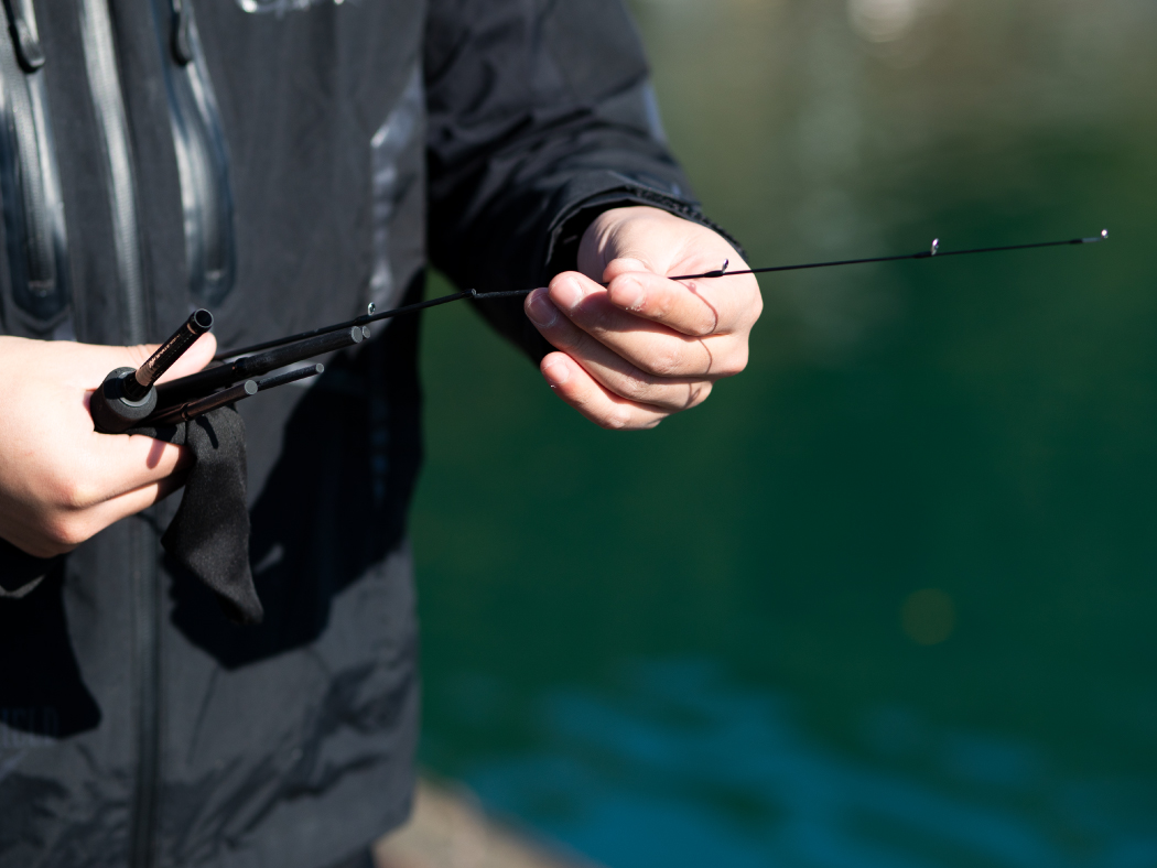 ソリッドタイプの先端部はアクション上、繊細なカーボンソリッド(チューブラーとの継穂)を使用しております。先端の一部に荷重が集中しますと、破損の原因となります。