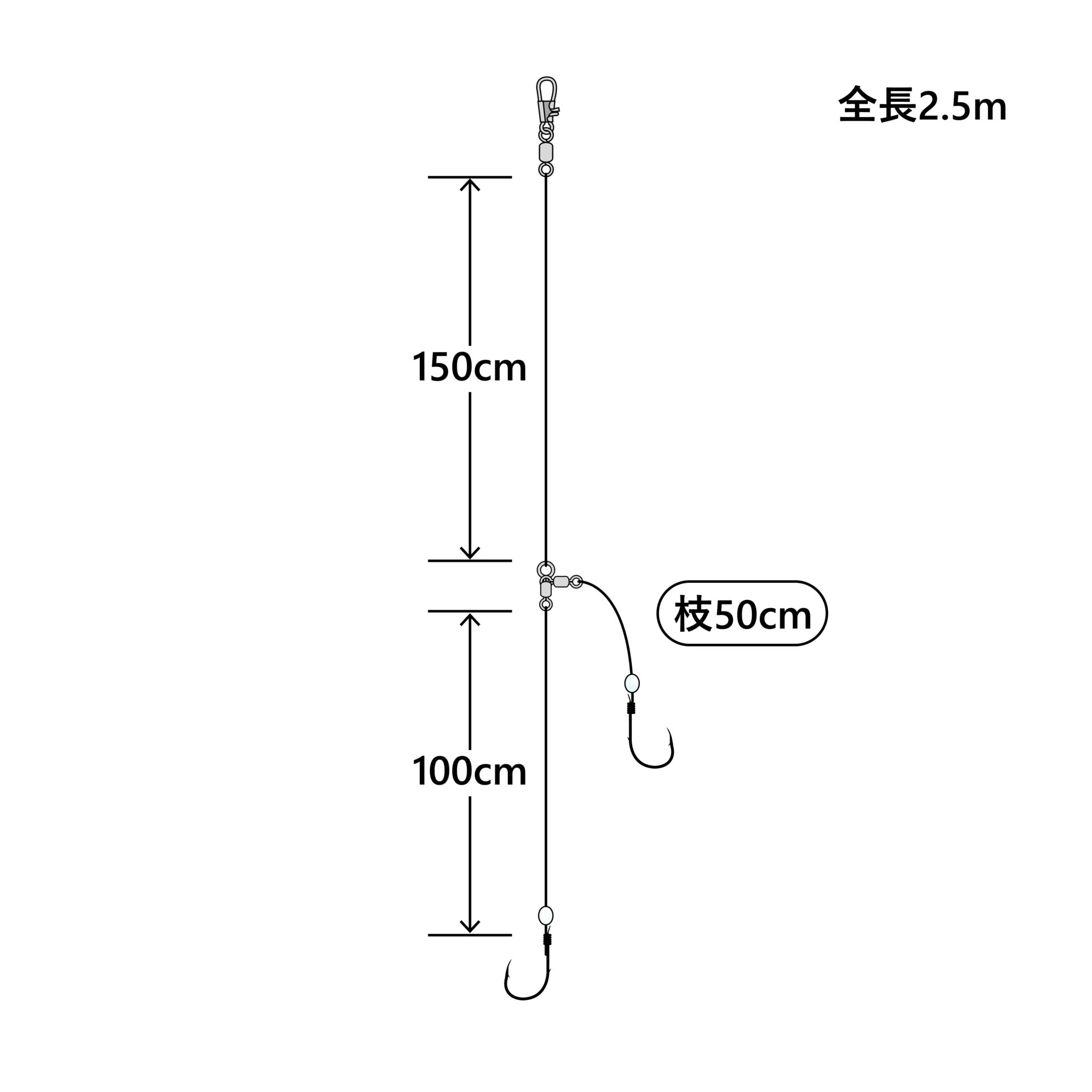大型アマダイ狙いとしてはスタンダードな全長2.5mの仕掛です。太ハリスの強靭設計で不意に喰ってくるハタなどにも余裕で対応できます。餌持ちが良く頑丈な「ケン付真鯛」を採用。
