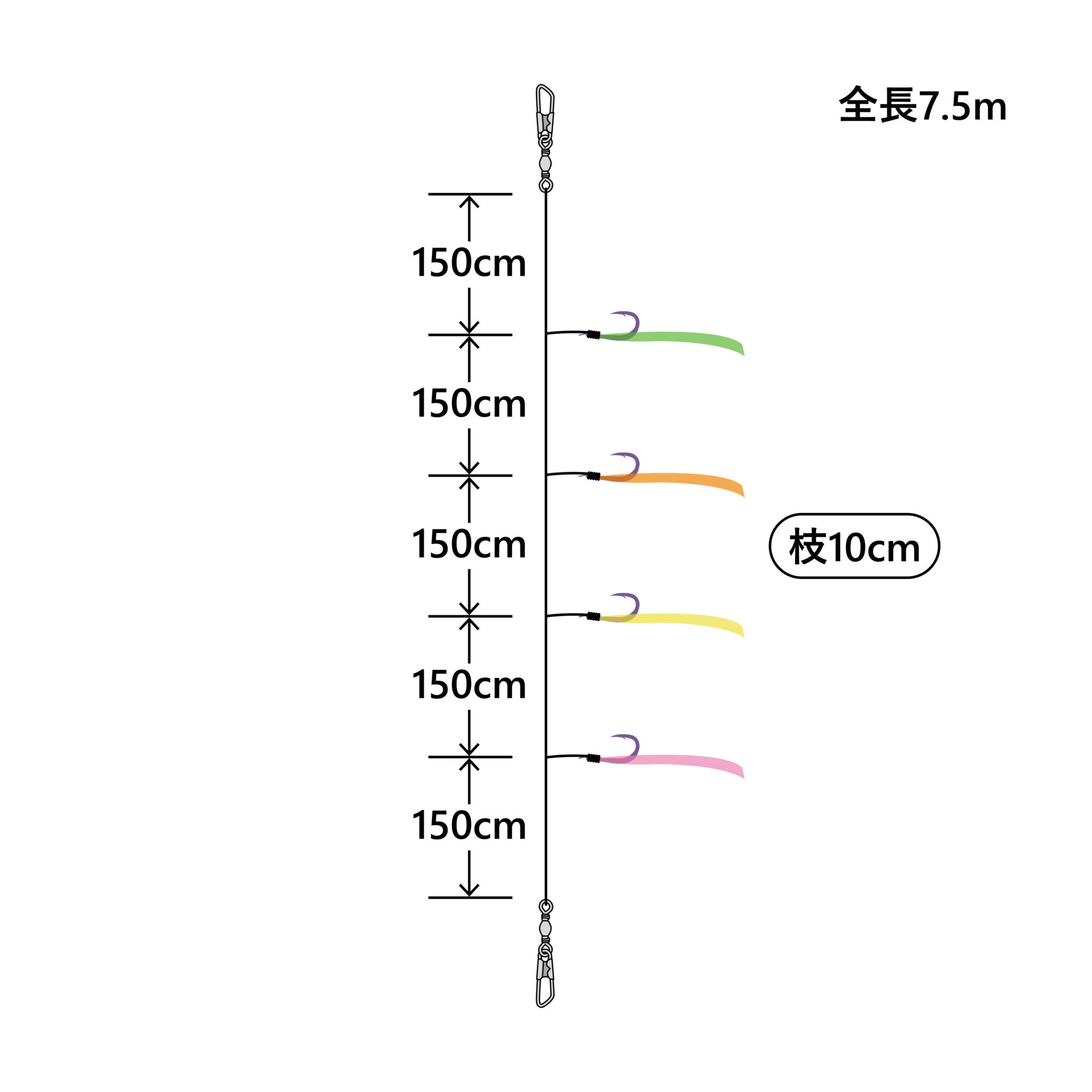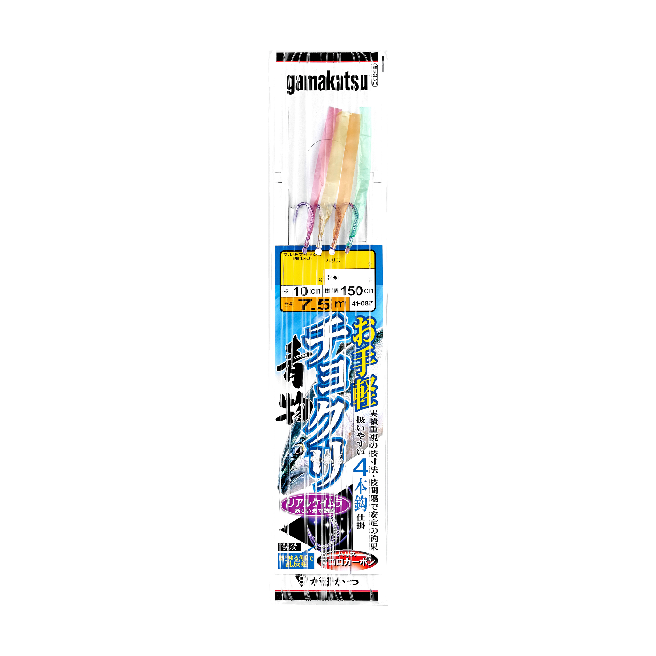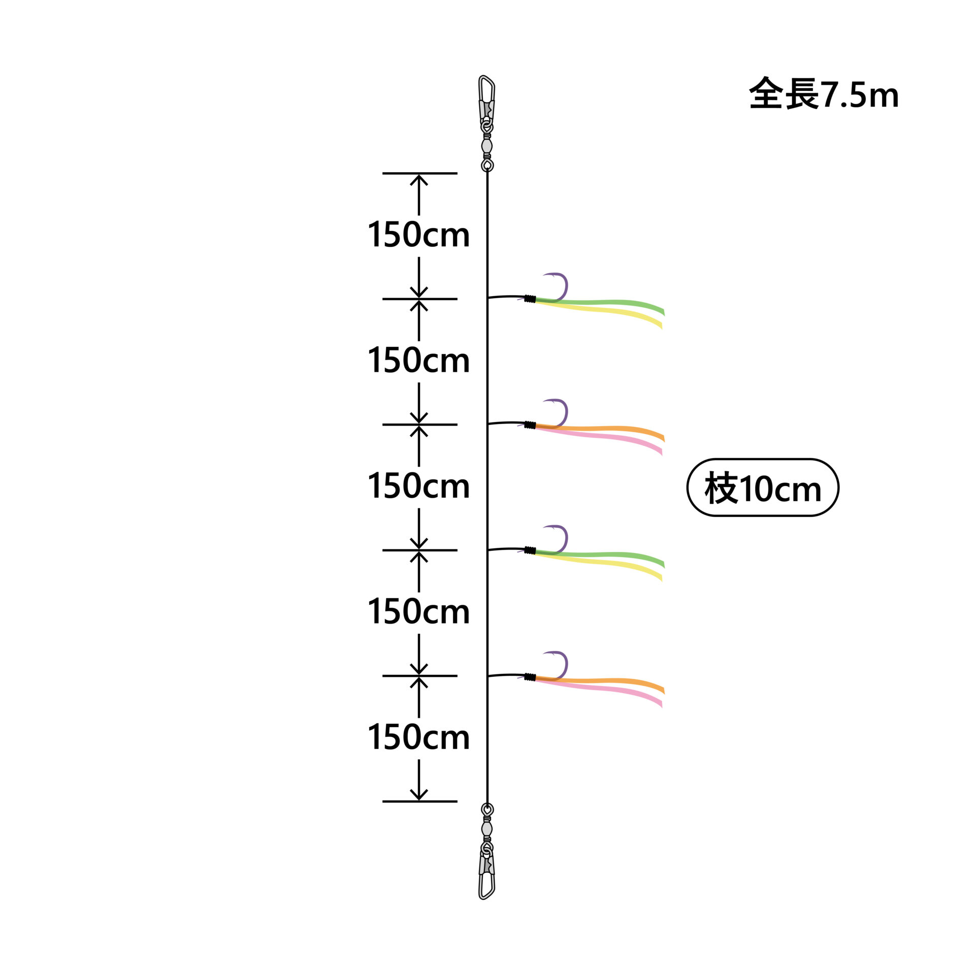 エダス10cm、枝間150cmと釣果を追求した仕様ながら、取り扱いやすい4本鈎設定。全層での釣果を上げるためスナップサルカンから上鈎、下鈎からスナップサルカンまでの間隔も150cm。 鈎は伊勢尼、青物用にはマルチフラッシュ喰わせでともにリアルケイムラカラーを使用。 テープ配色については、グリーン×イエロー、オレンジ×ピンクの合計4色を配色したマルチカラー設定と、定番のオレンジ、グリーンに加え、青物用には実績の高いグリーン、オレンジ、イエロー、ピンクの4色を使用するなど、こだわりの仕様。
