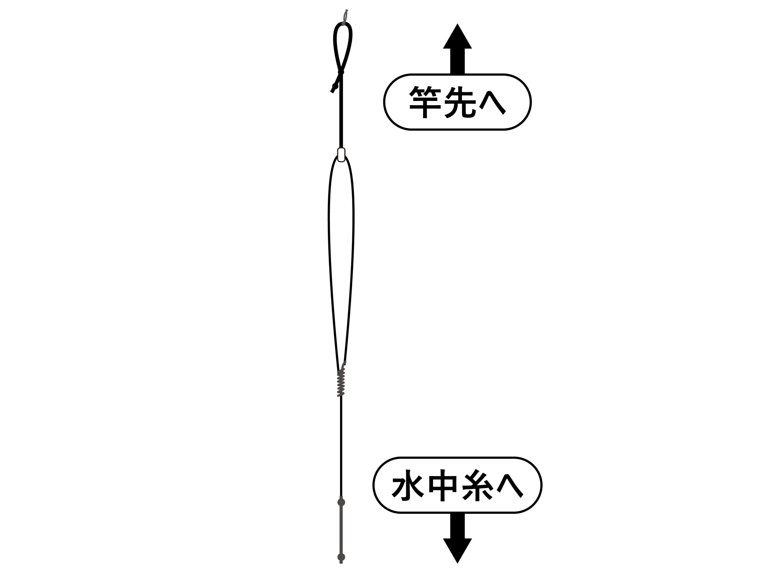 穂先へ輪を通し、矢印の方向に引っ張ると輪が縮まり、簡単にセットできます。