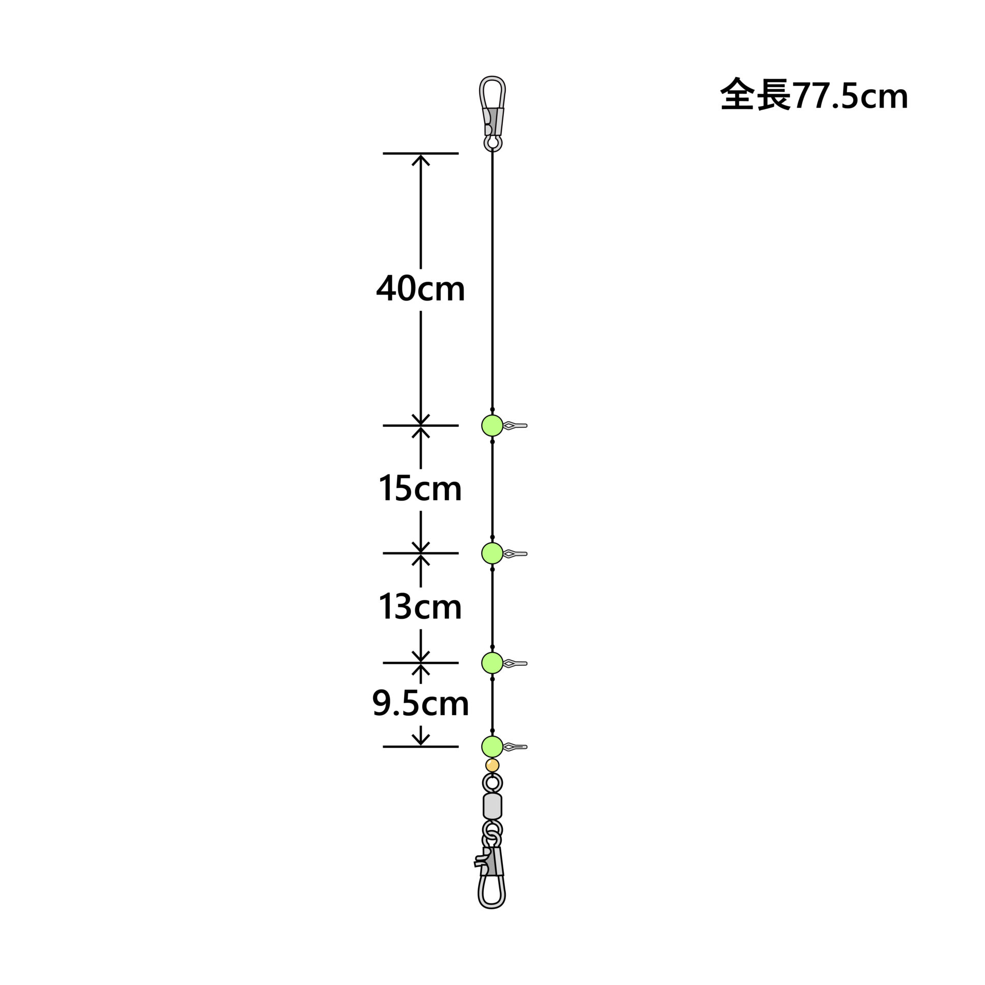 宙に浮いている状況や、底にべったりな状況で層(タナ)を直撃し、狭い間隔に集めた餌のアピール力で喰い気を誘います。キラキラと輝き強烈な集魚効果を発揮する下オモリに近い位置に鈎があることから、早く、効率よく餌を発見させることができます。