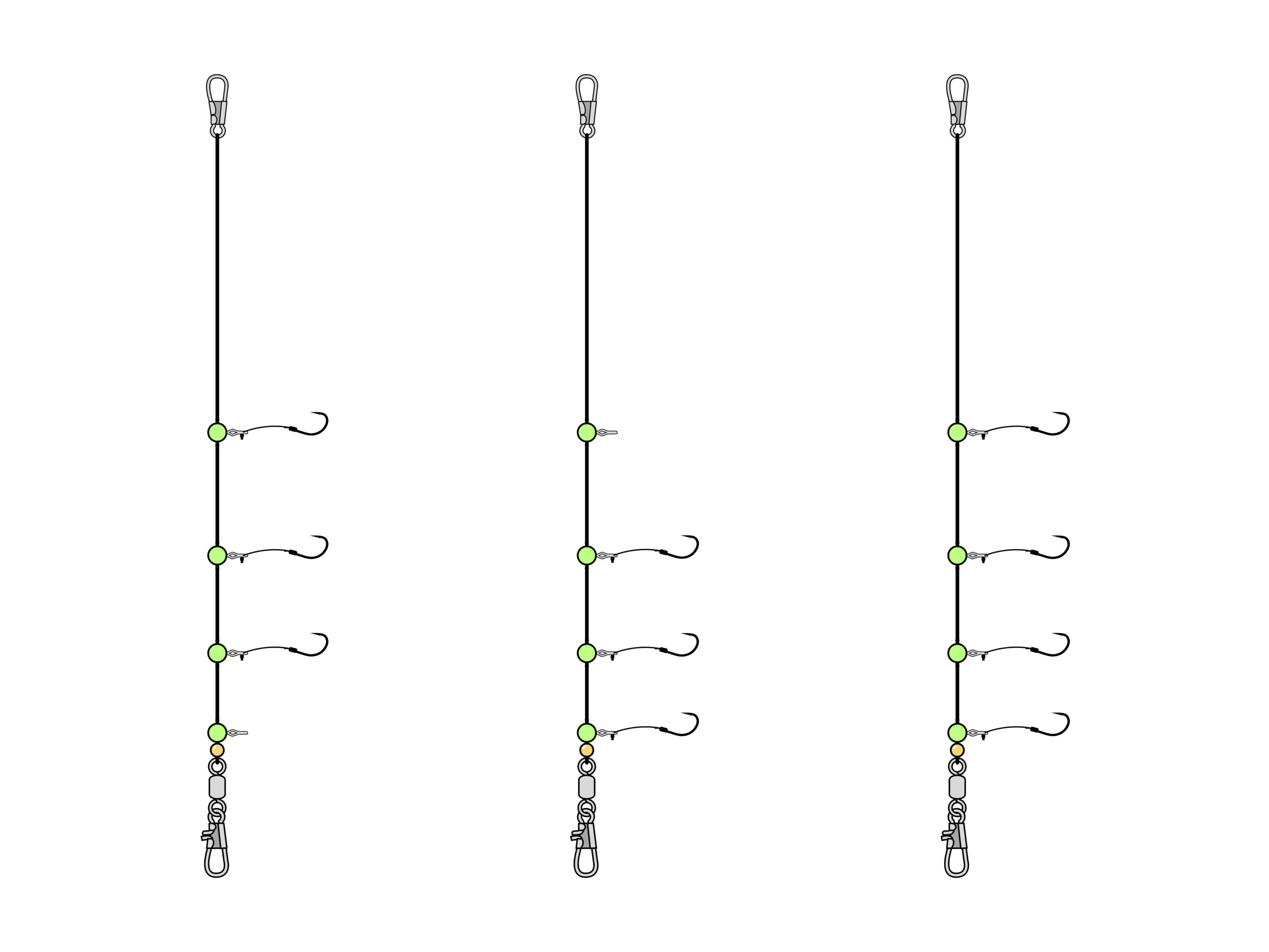 3本鈎が基本のカワハギ釣りにおいて、異端の4つのハリス止めビーズを使用した仕掛。鈎位置を変えることによって【スタンダード】【縦】両方の効力を発揮することができる【全層】仕掛。