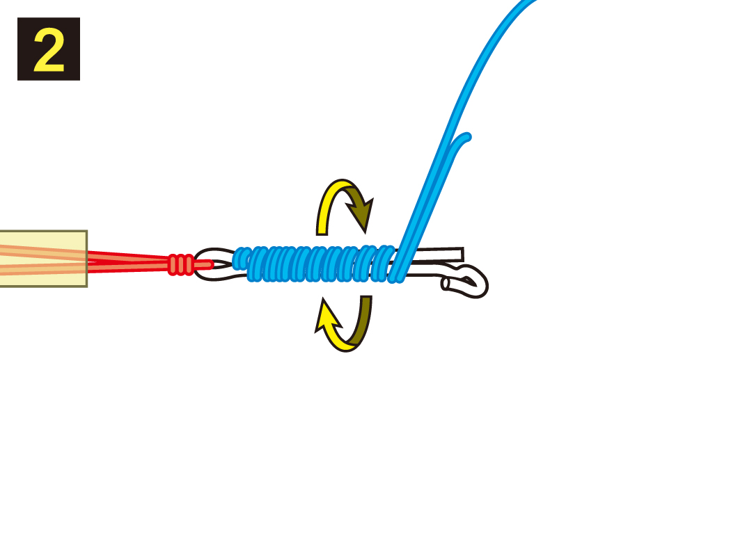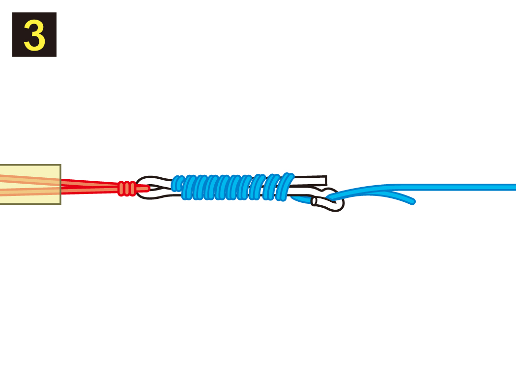 2.2本のPEラインを引っ張りながら10回程度巻きつけます。