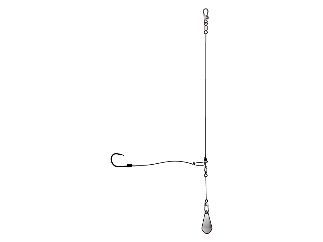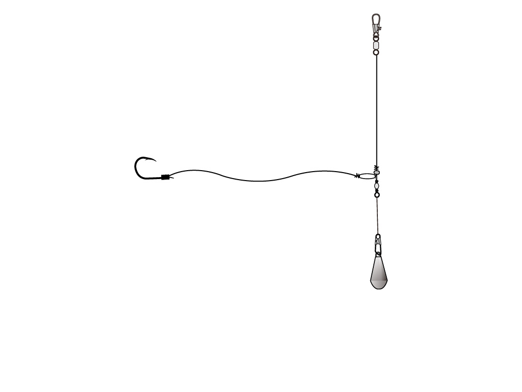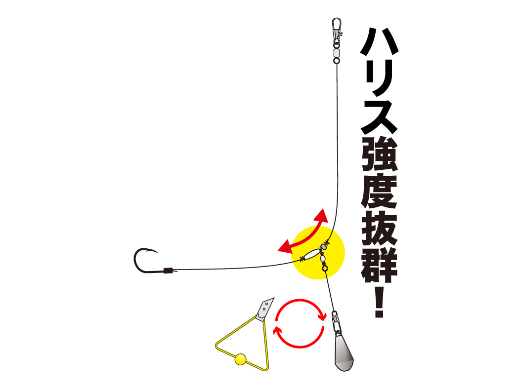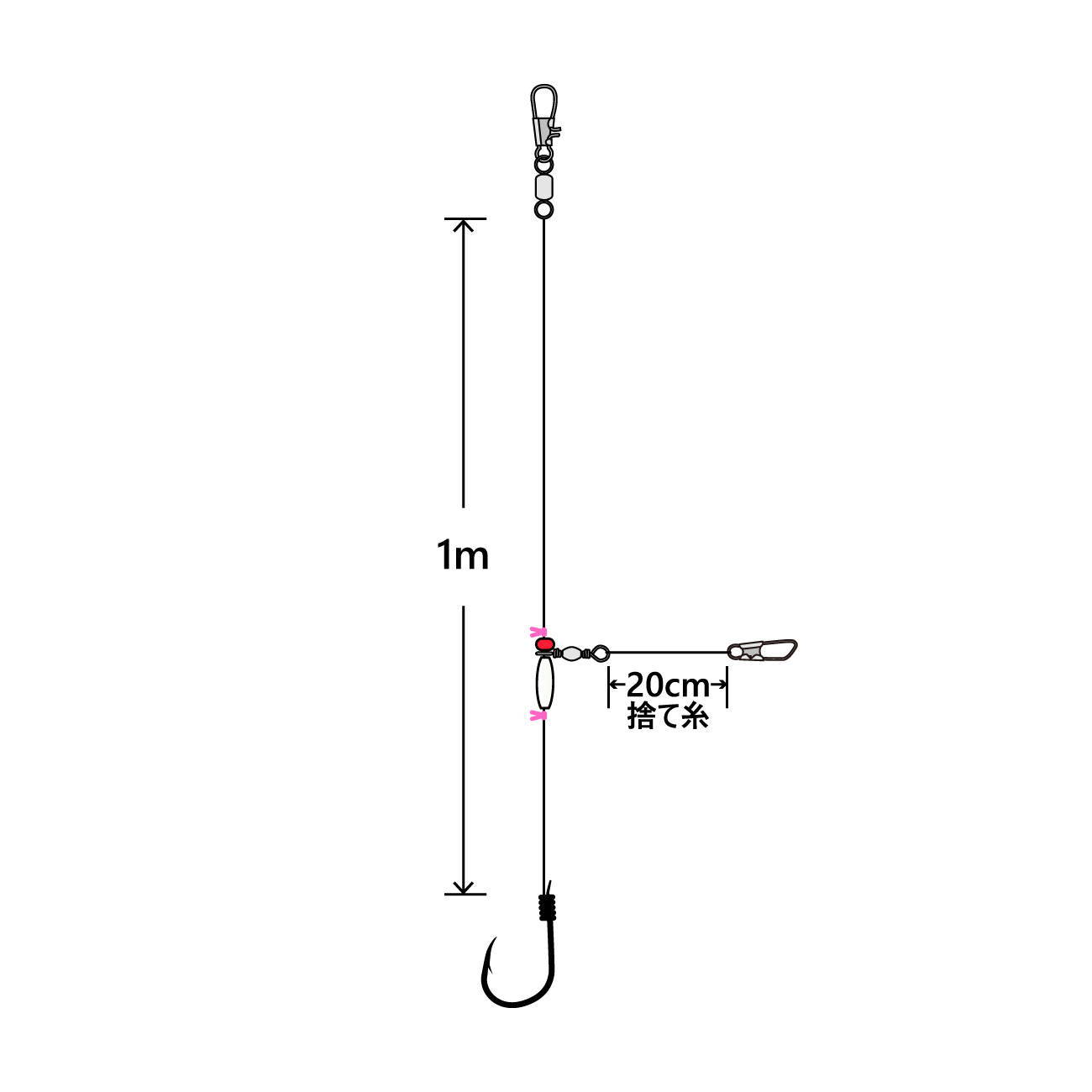 1mのハリスにオモリを付ける枝を付けることにより、ハリスによるクッション性が上がり、青物の急激な突っ込みにも耐えられるハリス強度を保てます。また、枝位置を動かせるので鈎~枝までの距離を好みの長さに調節できます。