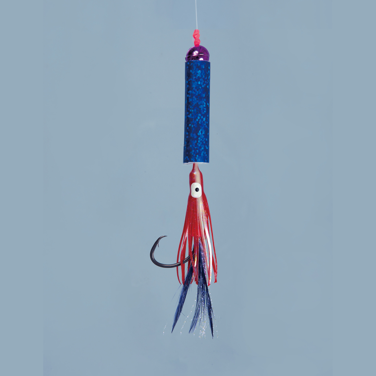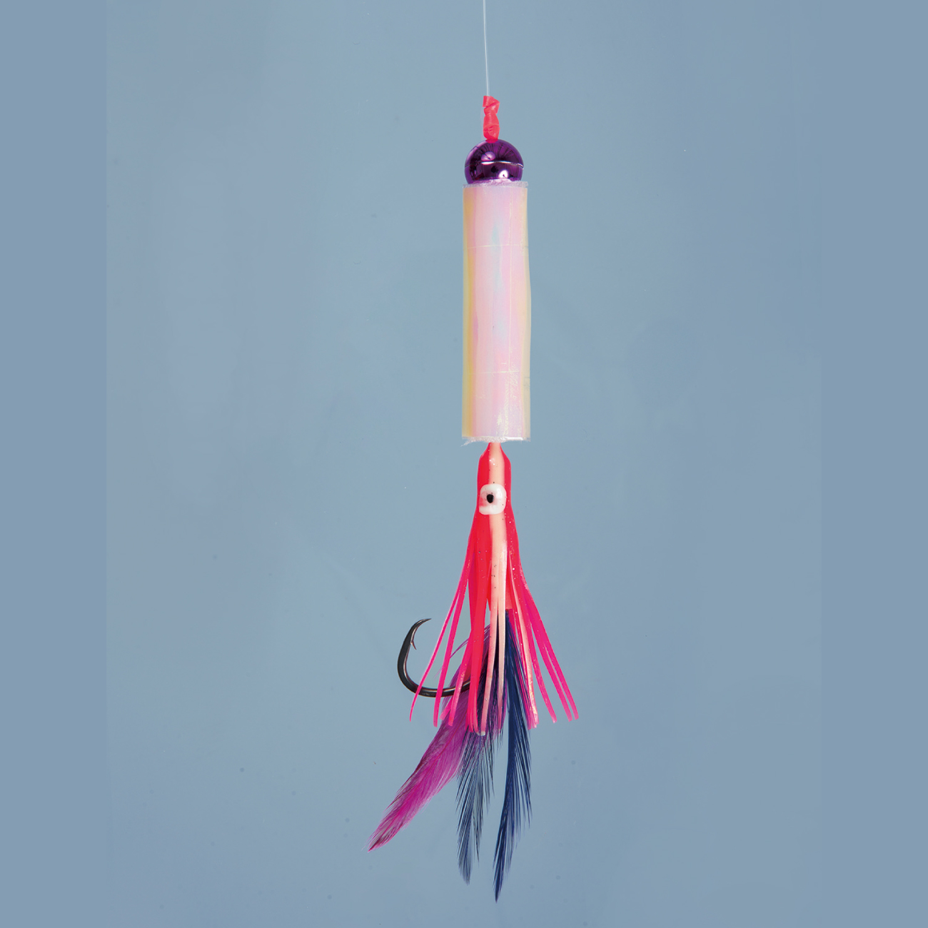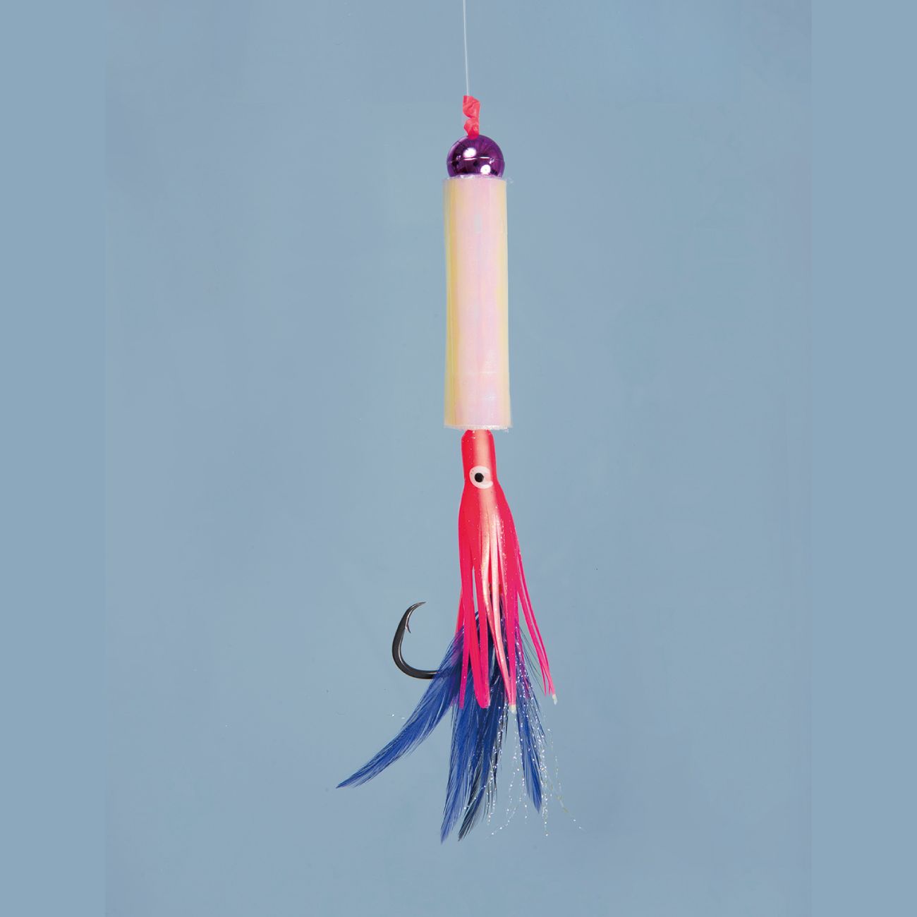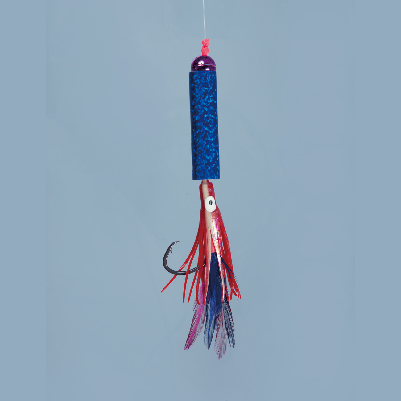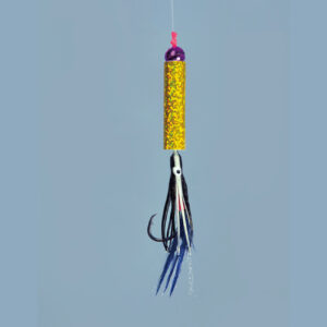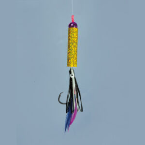 タコベイトに青色フェザーとラメの組合せでアキアジを誘惑します。鈎は貫通性能の高いネムリ形状の「ネムリアキアジ」を使用しています。